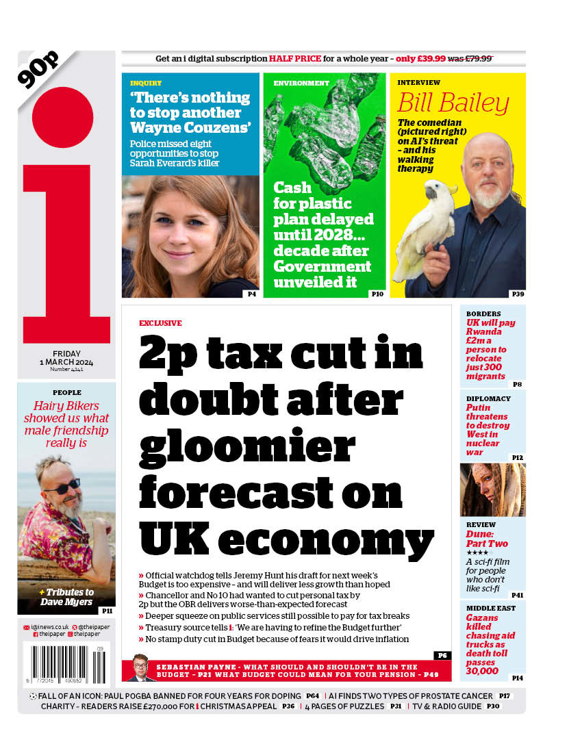 The i reports a potential U-turn on a 2p tax cut due to a bleak forecast from the Office for Budget Responsibility.