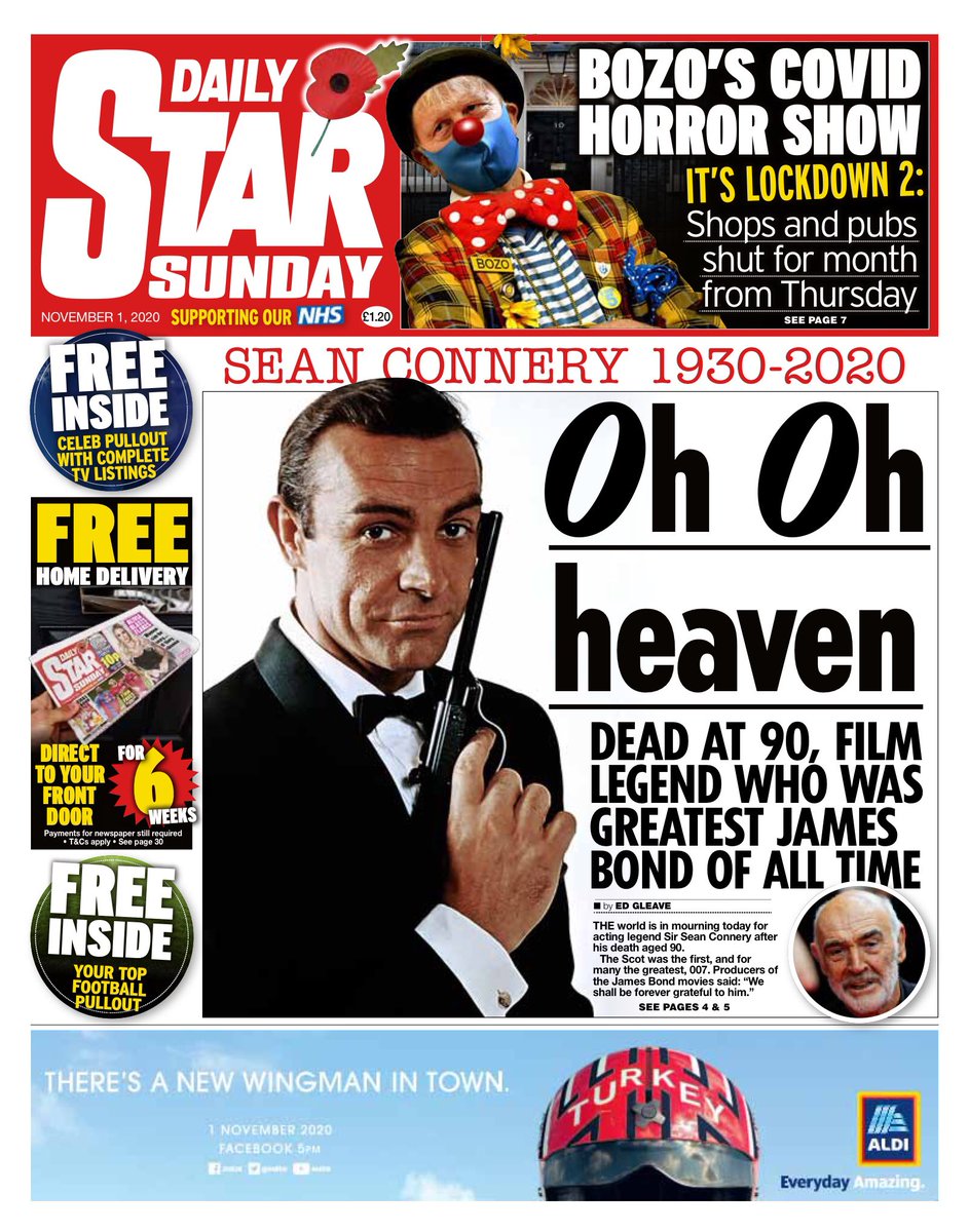 The Daily Star Sunday features Sir Sean Connery, whose family reported that he died aged 90 on Saturday.
