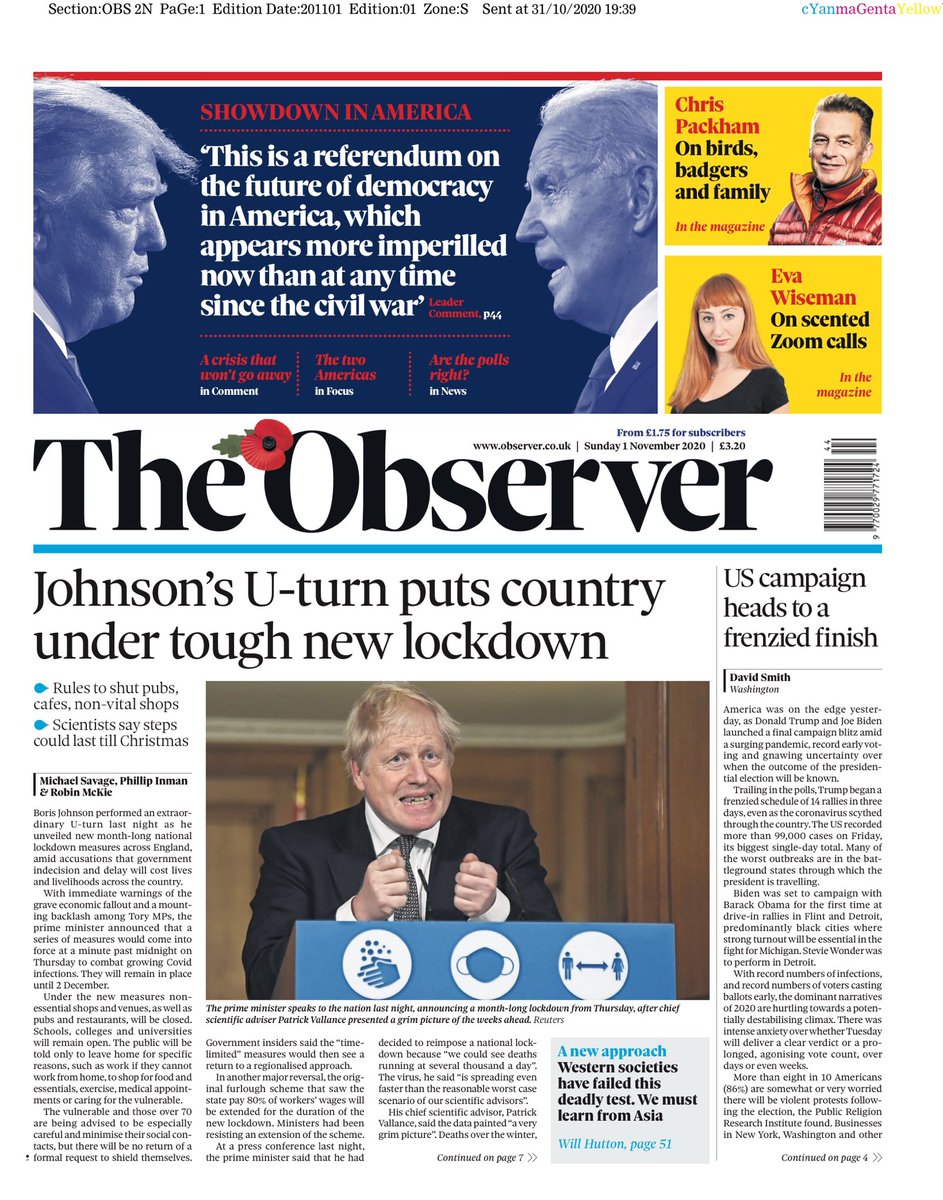The Observer leads with the prime minister’s announcement of a new national lockdown in England, describing it as “an extraordinary U-turn”.