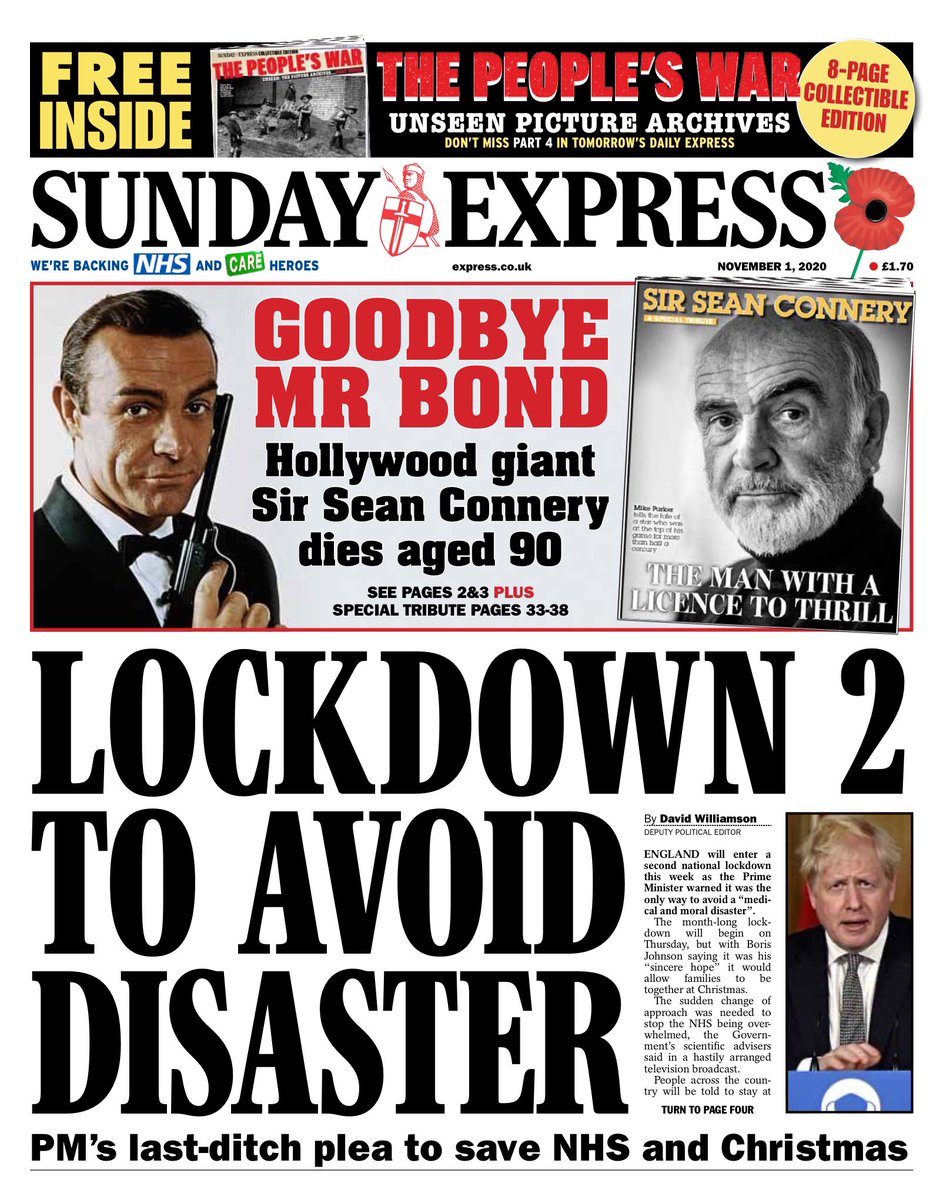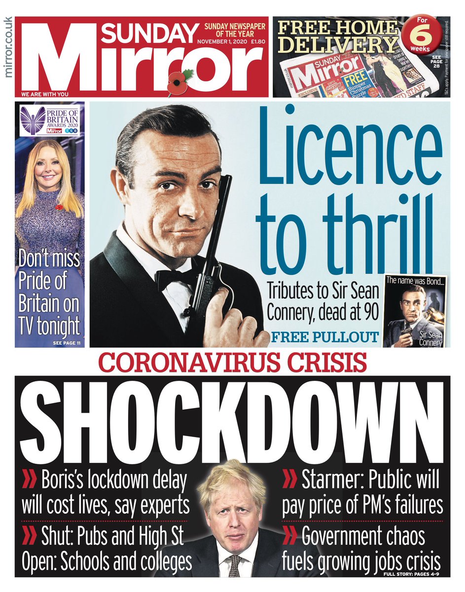 The Sunday Mirror splits its front page between the new lockdown and the death of Sir Sean Connery.