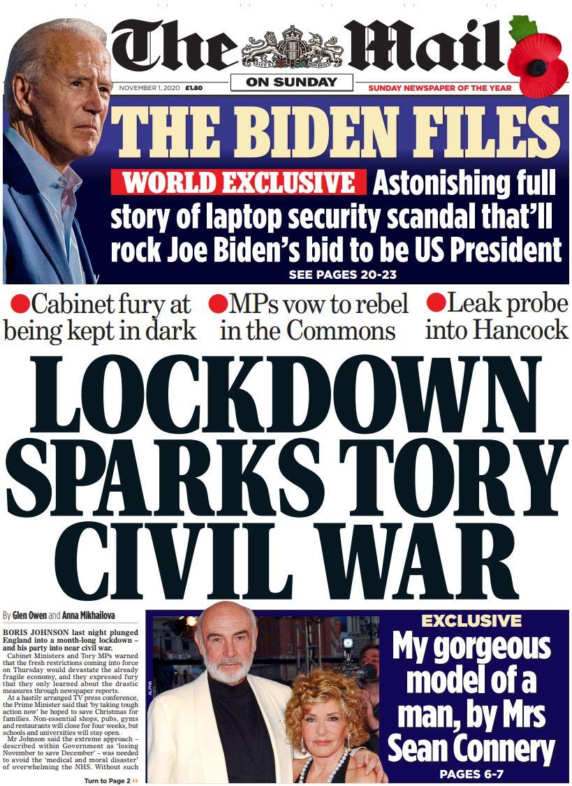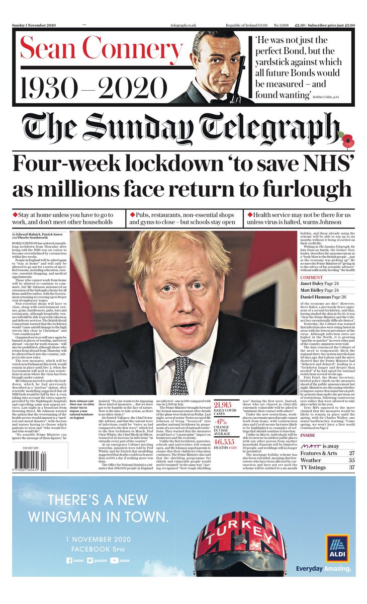 The Sunday Telegraph also leads on the month-long lockdown from Thursday, noting the prime minister’s warning about it being necessary to stop the NHS from being overwhelmed.