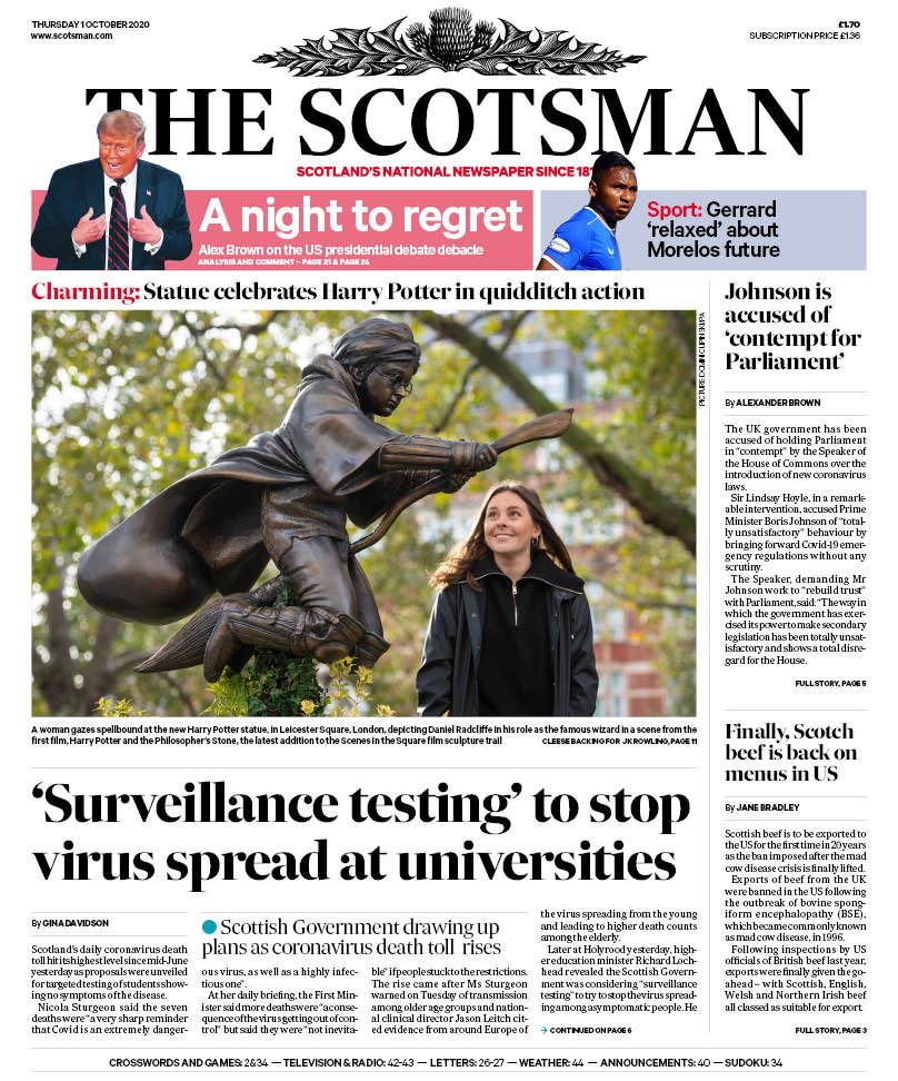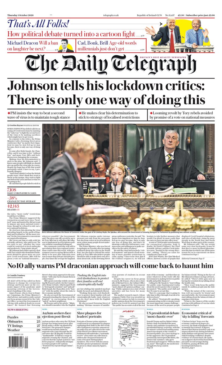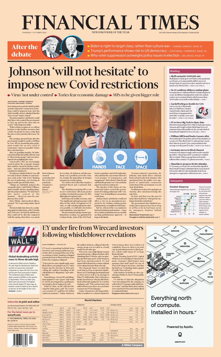The Financial Times says the prime minister “put the British public on notice” that more coronavirus restrictions might soon be needed when he appeared alongside his advisers on Wednesday.