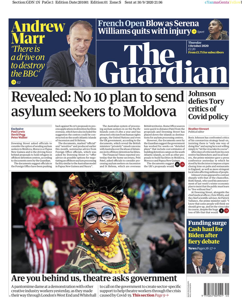 The Guardian also leads on the asylum seekers story and says Downing Street asked officials to look at sending people to Moldova, Morocco or Papua New Guinea for processing.