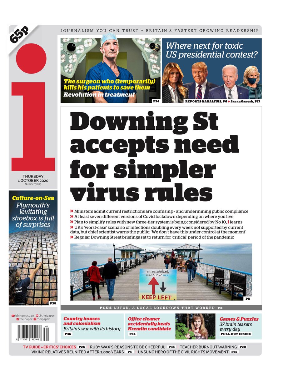 Downing Street accepts the need for simpler coronavirus rules and is considering a new three-tier system, the i says.