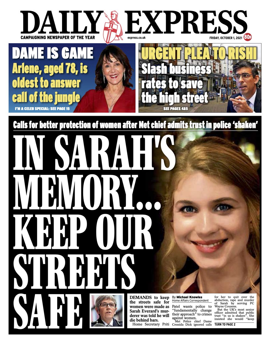 The Daily Express reports on calls to make the streets safe for women, following the sentencing of Sarah Everard’s killer, former police officer Wayne Couzens.