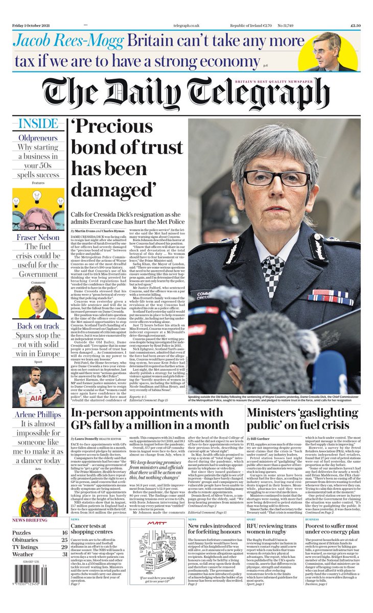 The Daily Telegraph reports on the task facing the Metropolitan Police to rebuild trust, following revelations that Wayne Couzens used his job as a police officer to trick Sarah Everard into thinking she was being arrested, before he raped and murdered her.
