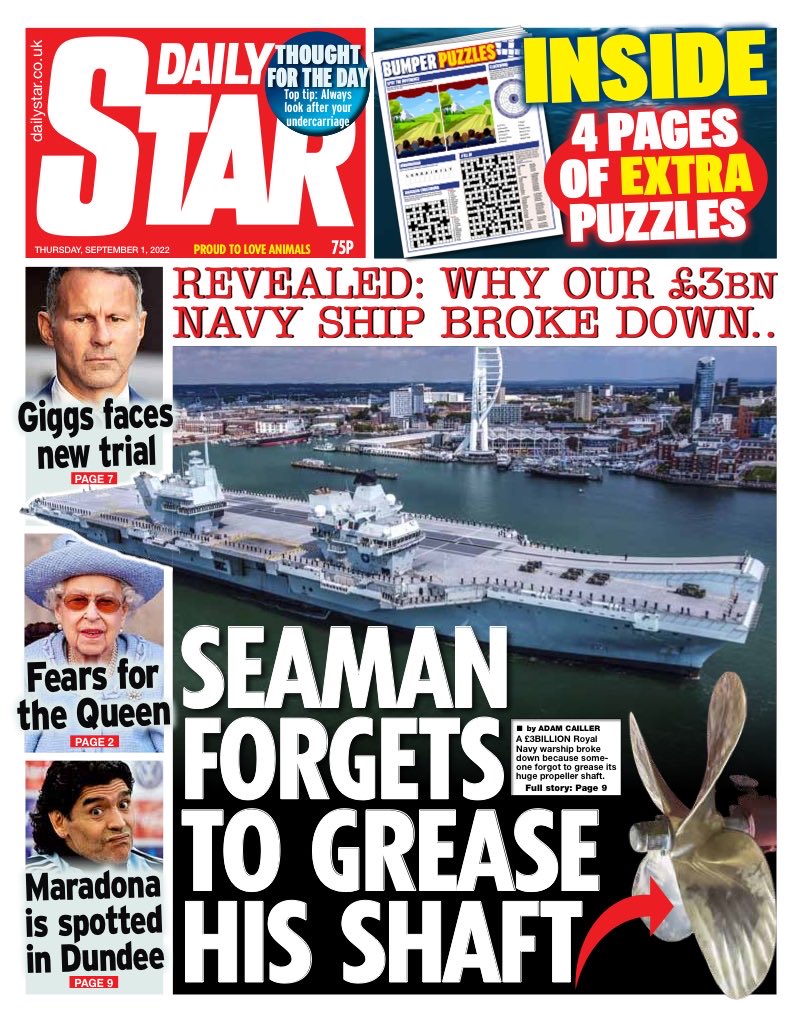 A £3 billion Royal Navy warship broke down because its propeller shaft was not greased, according to the Daily Star.