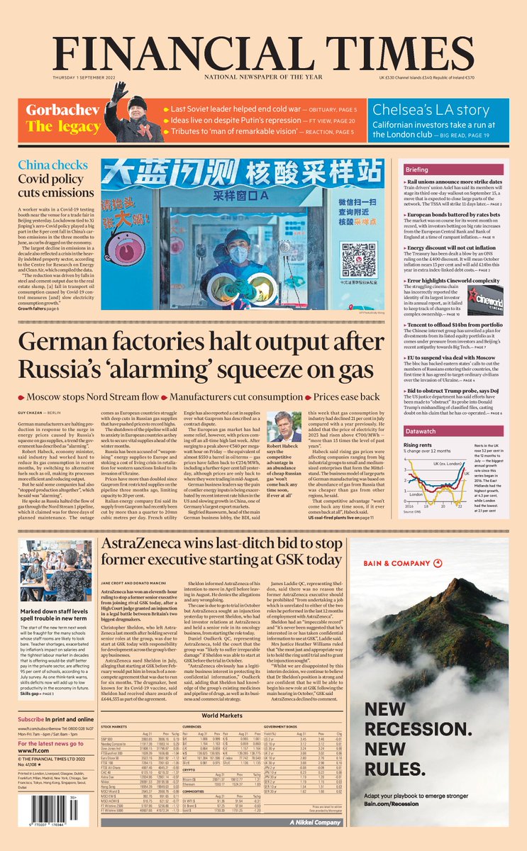 According to the Financial Times, German manufacturers are halting production due to Russia’s squeeze on gas supplies, causing energy prices to spike.