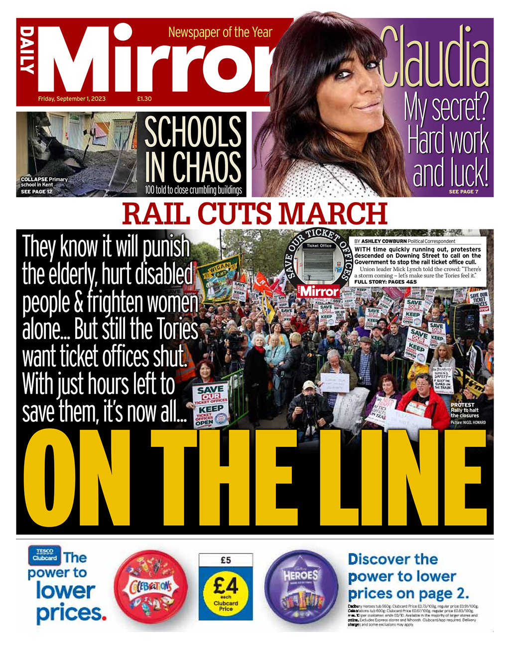 The Daily Mirror reports that demonstrators have gathered at Downing Street demanding the government halt the closure of railway ticket offices.