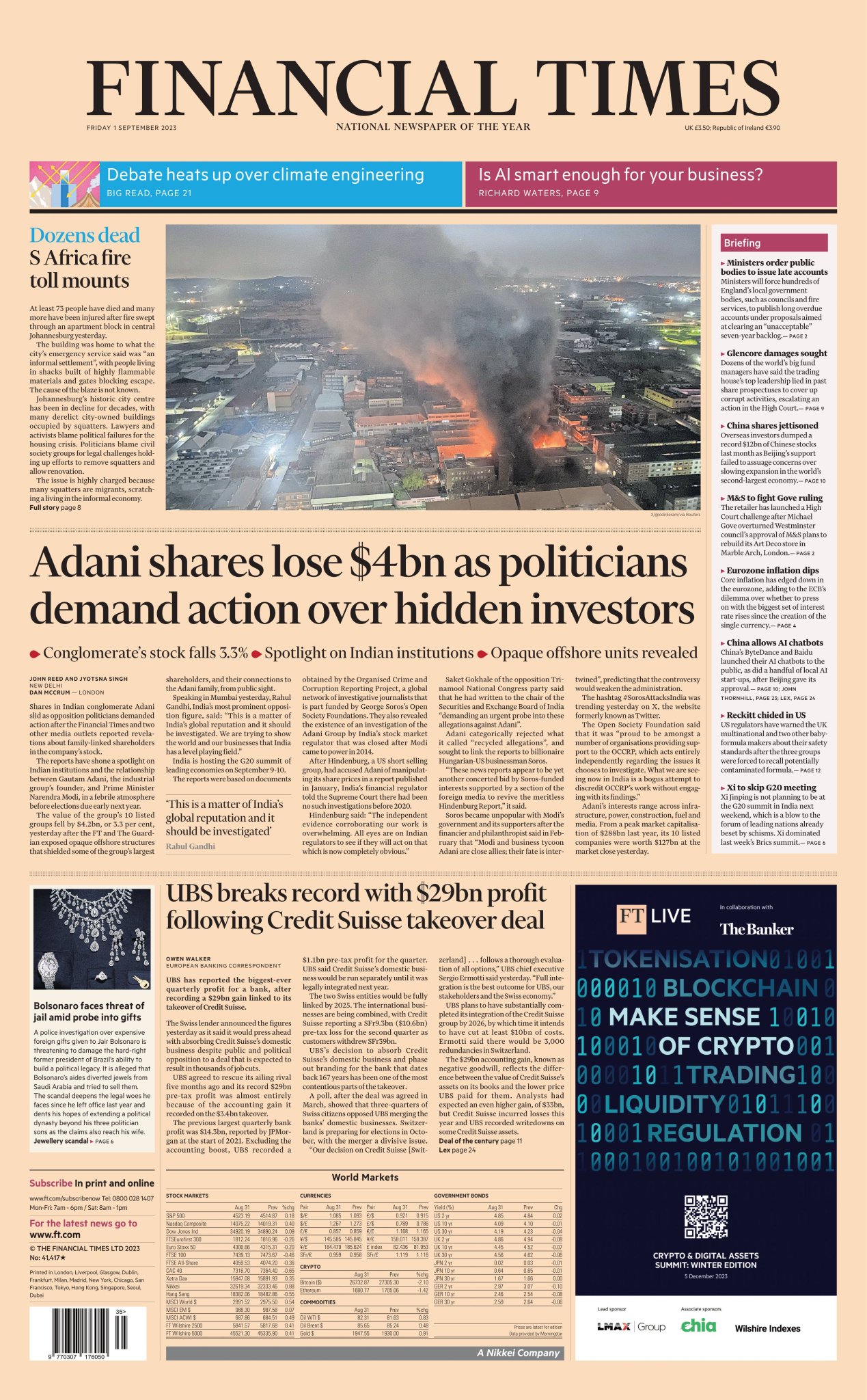 The Financial Times reports that shares in Indian conglomerate Adani dropped as opposition politicians called for action following revelations about family-linked shareholders in the company.