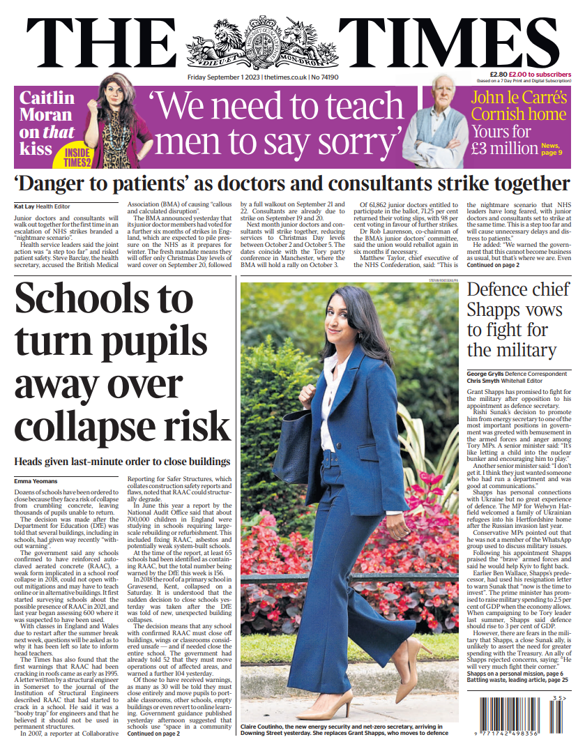 The Times reports that dozens of schools have been instructed to close due to the risk of collapse from deteriorating concrete.