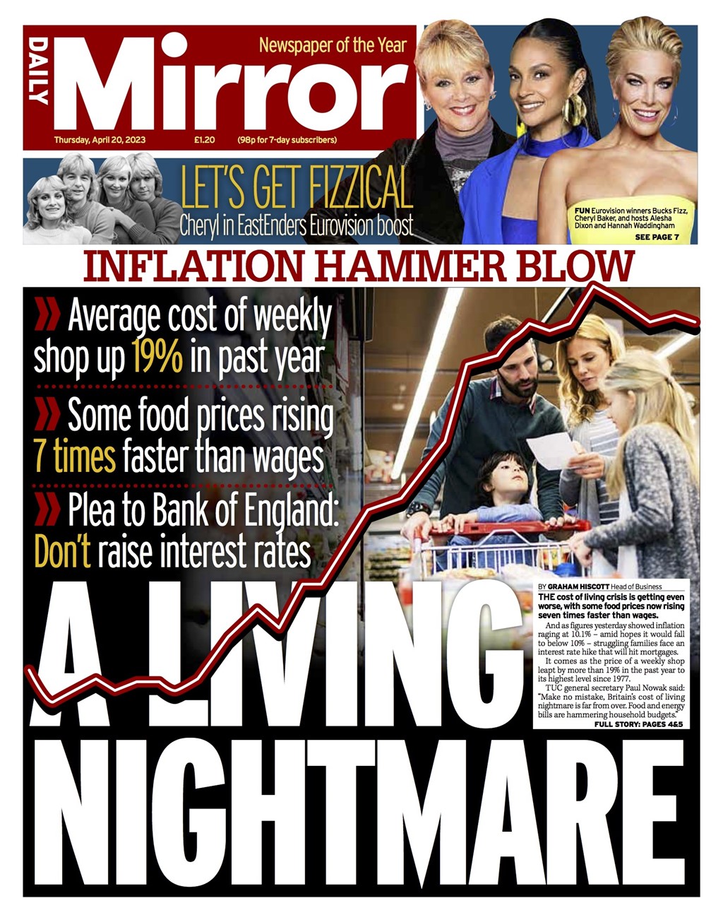 The Daily Mirror reports the worsening cost of living crisis, with certain food prices increasing seven times faster than wages.