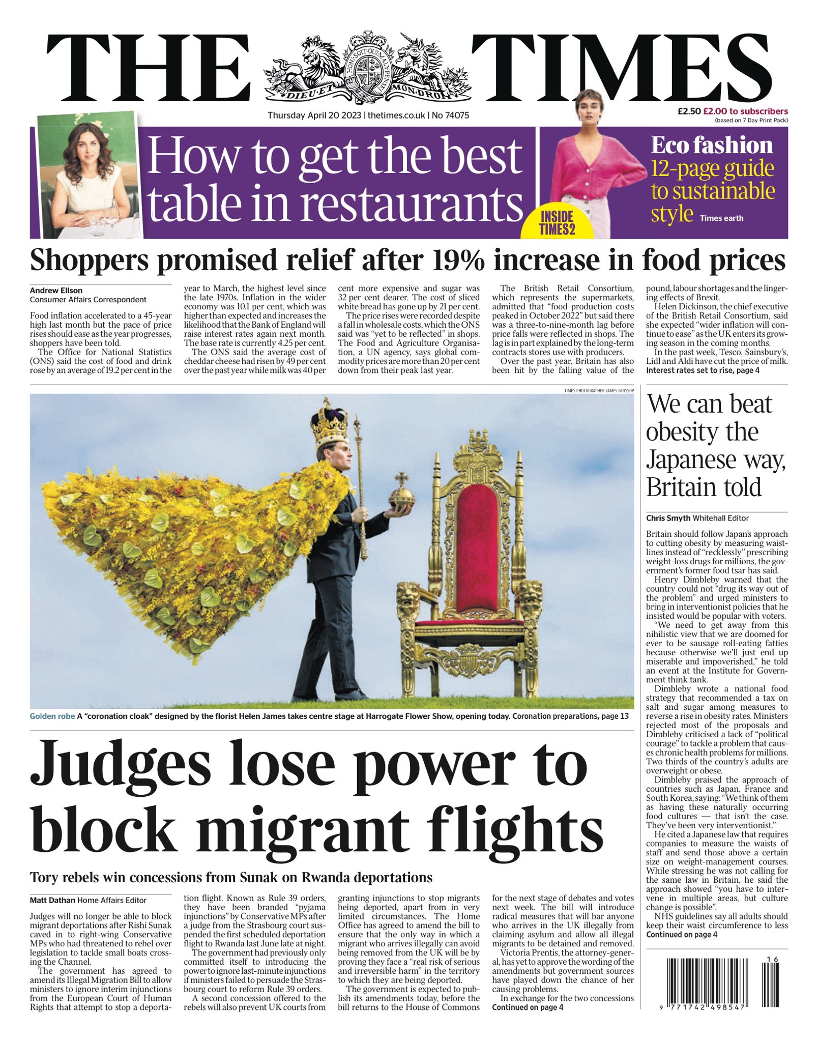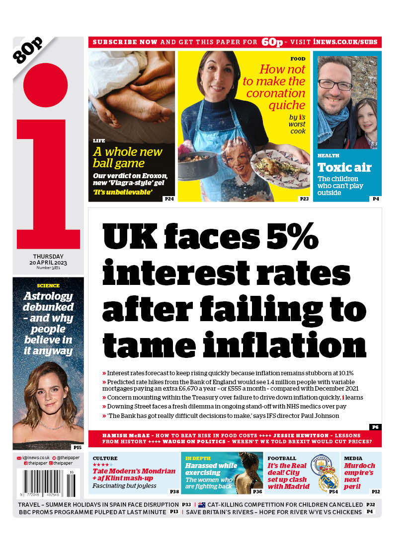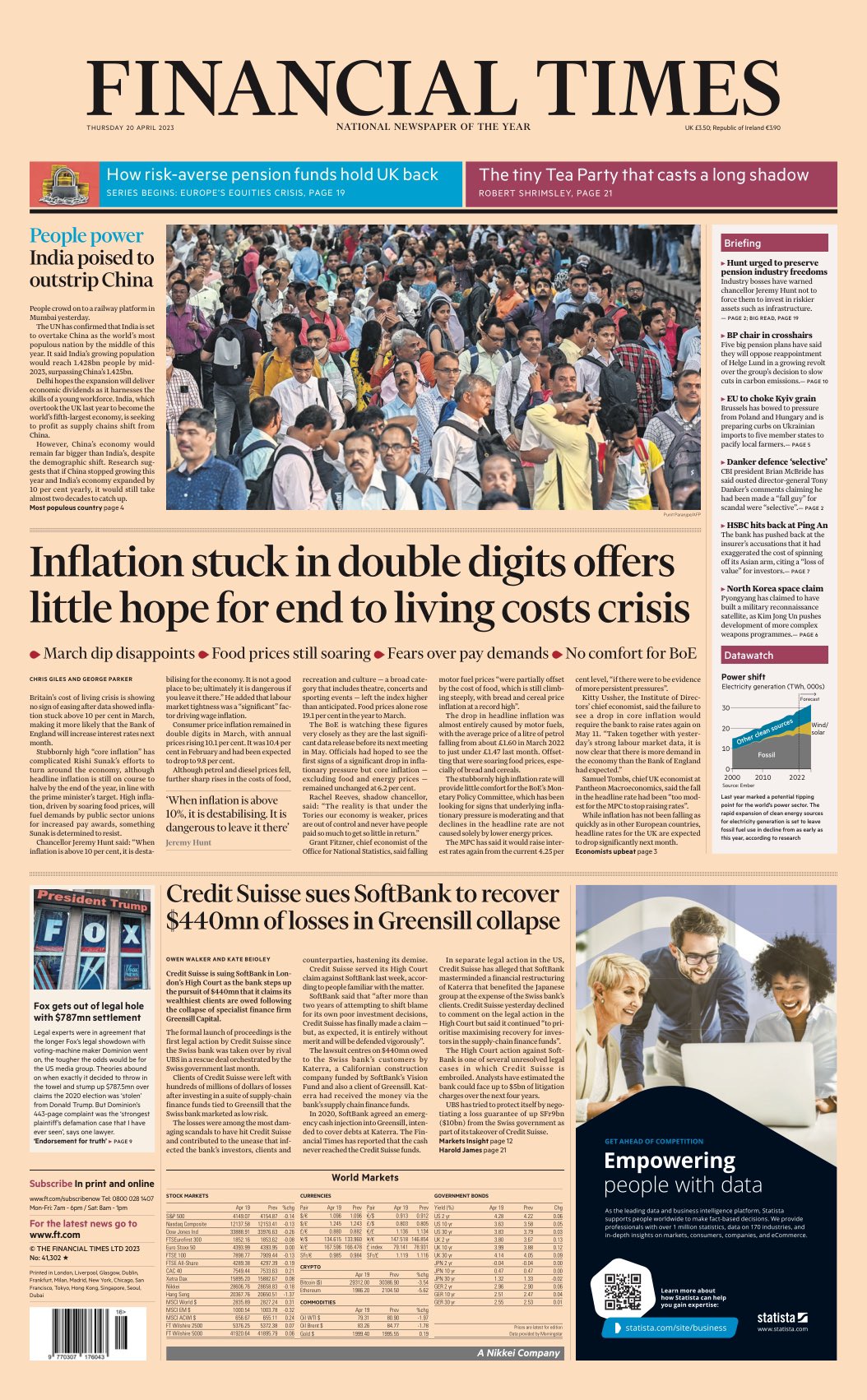 The Financial Times notes that the UK’s cost of living crisis persists, with inflation remaining above 10% in March.
