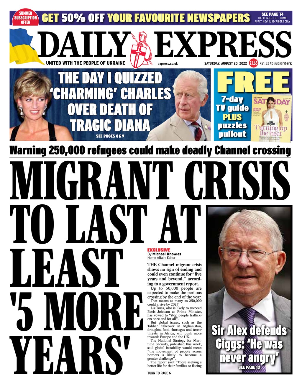 The Daily Express reports the government report says the Channel migrant crisis may continue for “five years and beyond”, adding up to 50,000 people are expected to cross by the end of 2022.