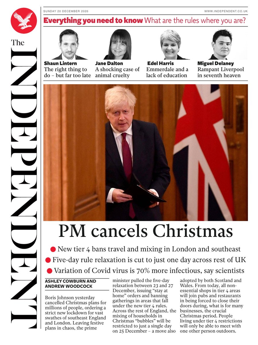 The Independent says that Boris Johnson has “cancelled Christmas”, banning millions of people from mixing and allowing others just a day with family, instead of the previously promised five days.
