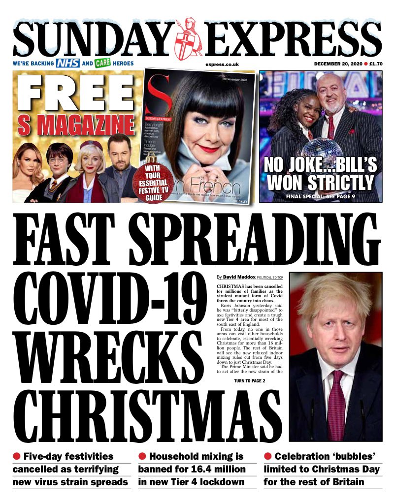 The Sunday Telegraph reports that people planning to leave Tier 4 areas have been told to unpack their bags as Christmas celebrations are cancelled for millions.