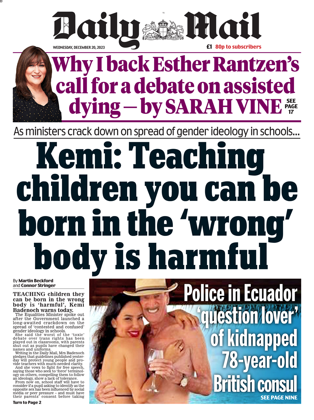 The Daily Mail highlights Equalities Minister Kemi Badenoch’s warning against teaching children about contested gender ideologies.