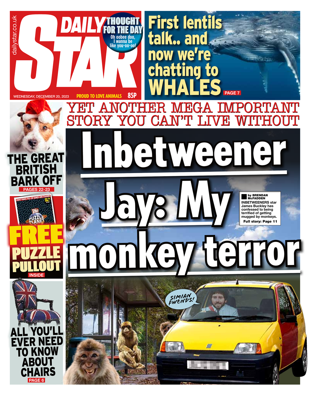 The Daily Star reveals that James Buckley, star of Inbetweeners, admits to a fear of monkey muggings.