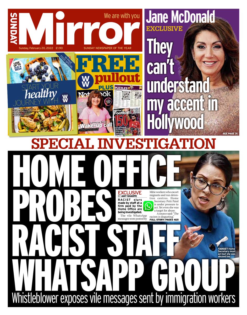 The Sunday Mirror leads with news of an investigation into racist slurs made by staff at a firm paid by the Home Office.