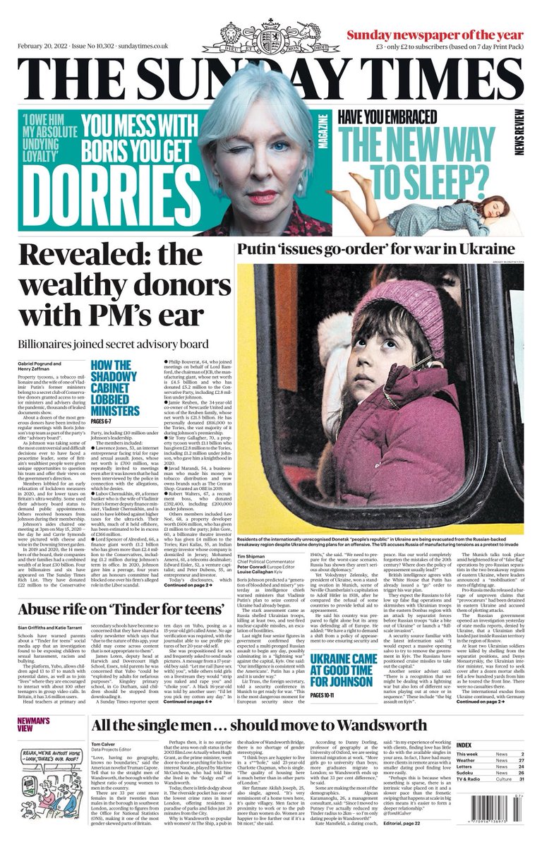 The Sunday Times leads with an investigation into the wealthy donors who have the ear of the prime minister.
