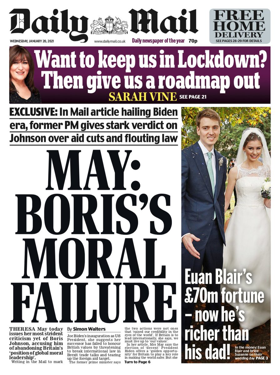 Former prime minister Theresa May has written an article in the Daily Mail in which she accuses Boris Johnson of abandoning the country’s “position of global moral leadership” and failing to honour British values.