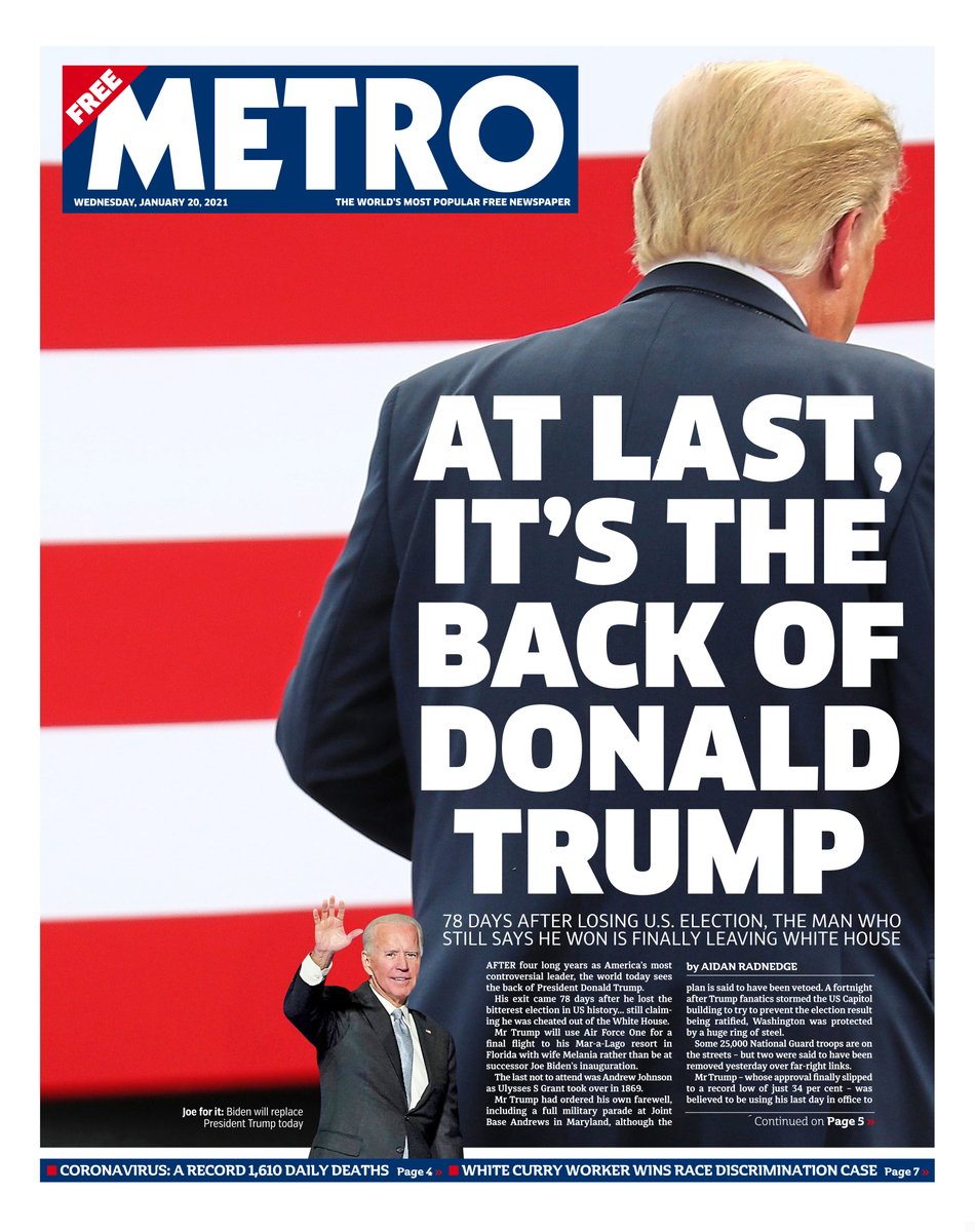 Metro celebrates the end of Donald Trump’s time in power and notes that he will be the first president since 1869 not to attend his successor’s inauguration.