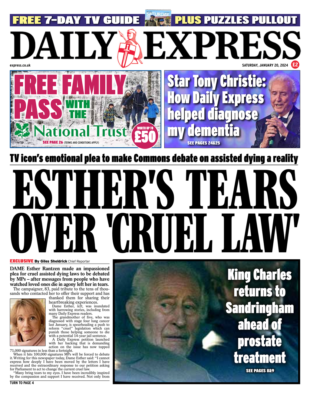 The Daily Express highlights TV presenter Esther Rantzen’s call for a parliamentary debate on assisted dying laws.