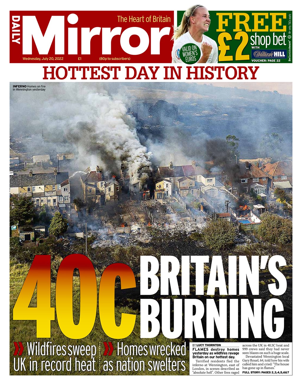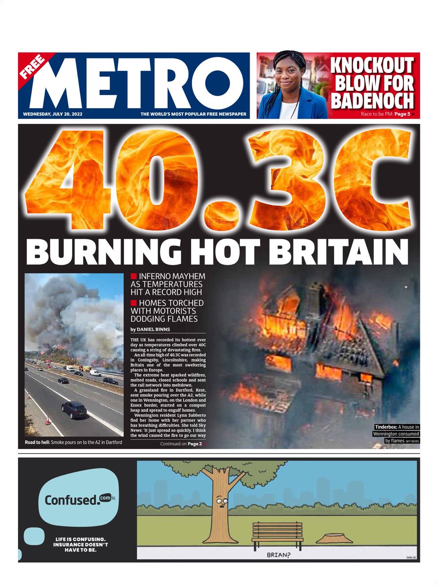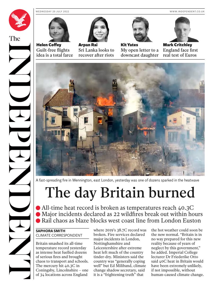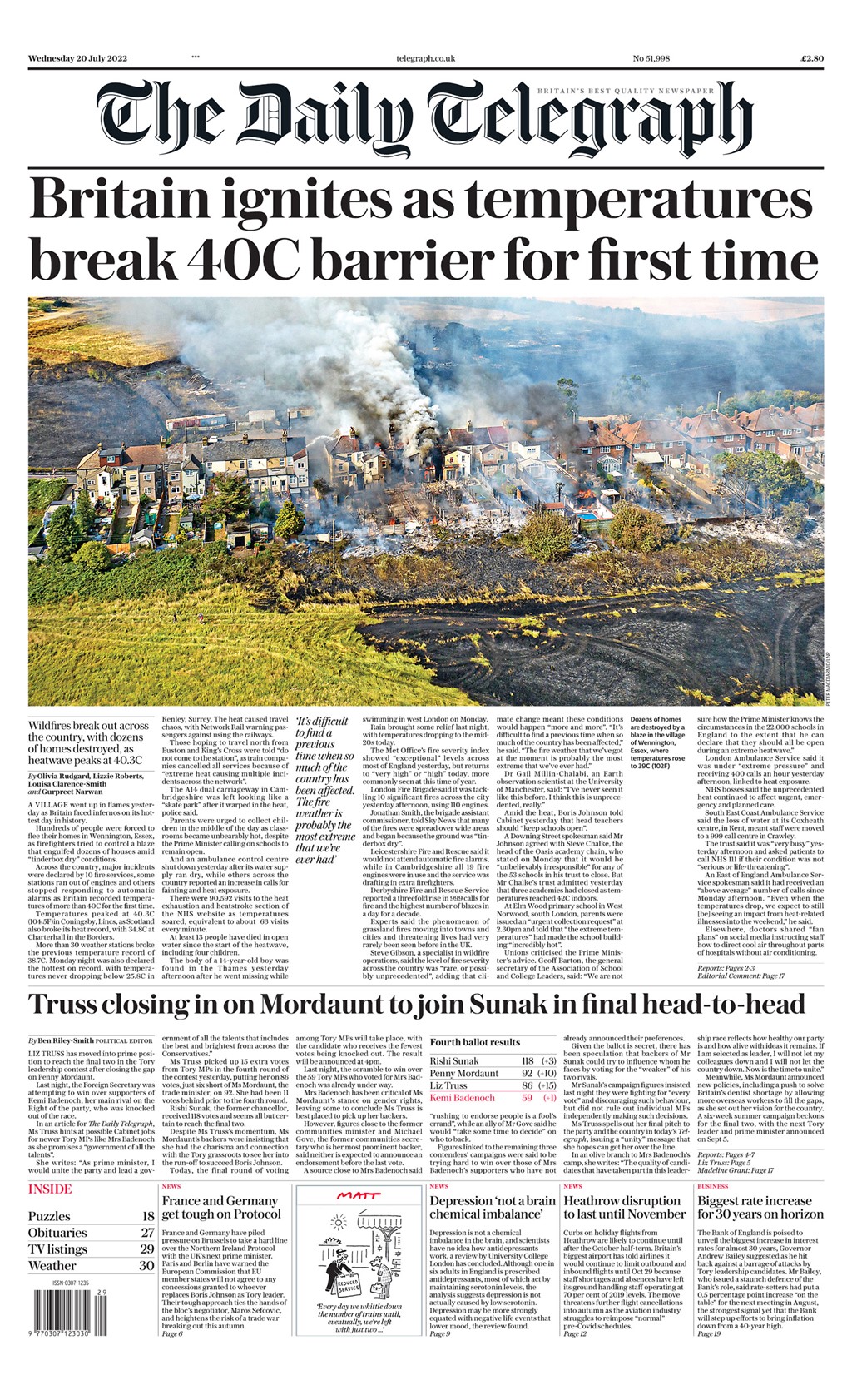 In The Daily Telegraph, the heatwave and wildfires also take center stage.