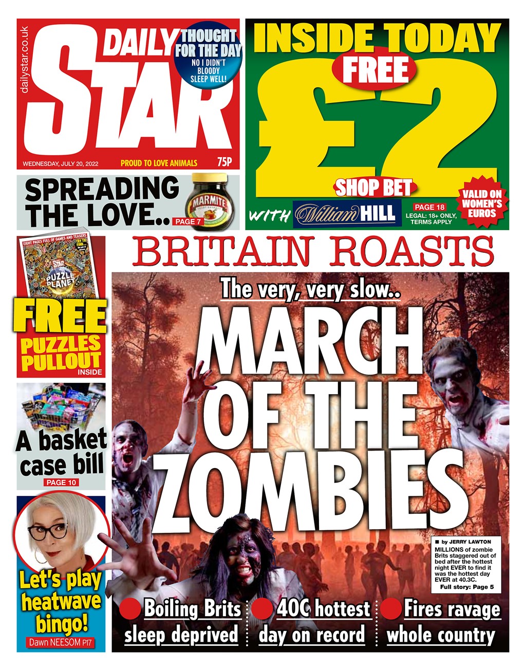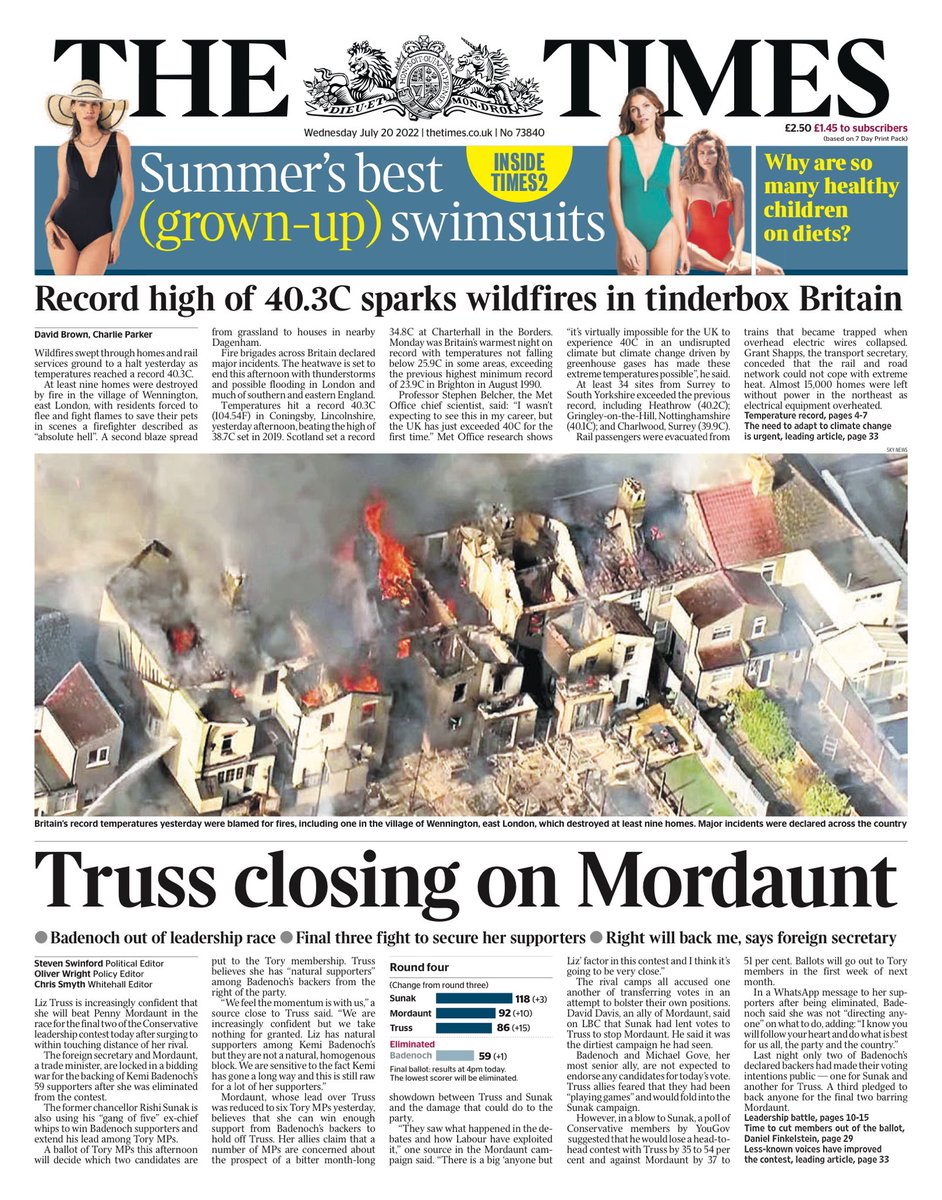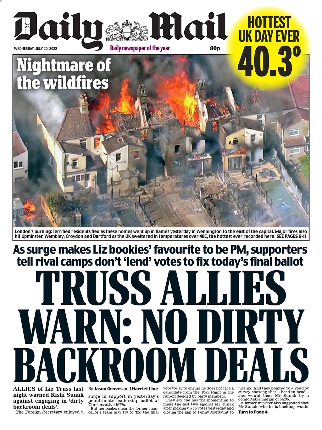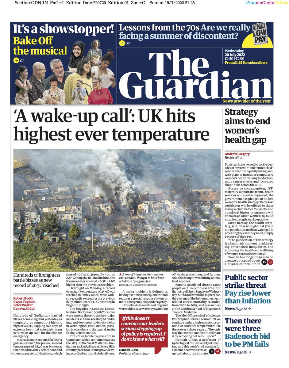 In The Daily Telegraph, the heatwave and wildfires also take center stage.