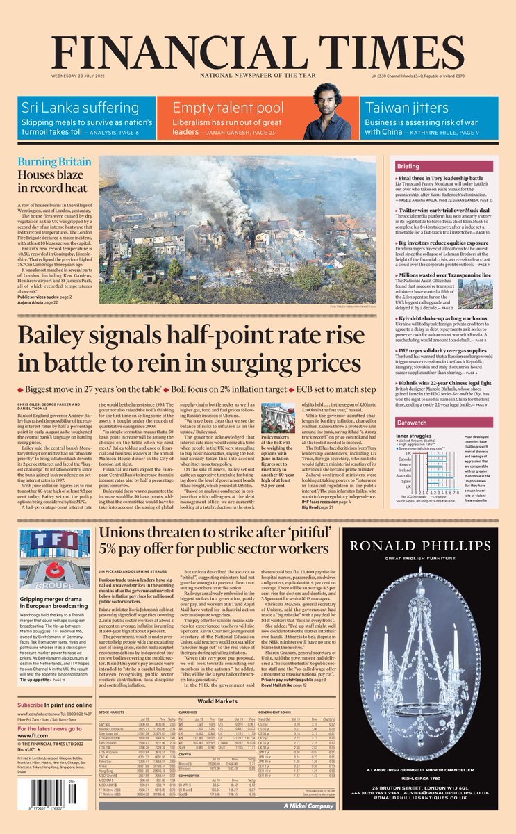 After a “pitiful” 5% pay offer for public sector workers, unions are threatening to strike, reports the Financial Times.