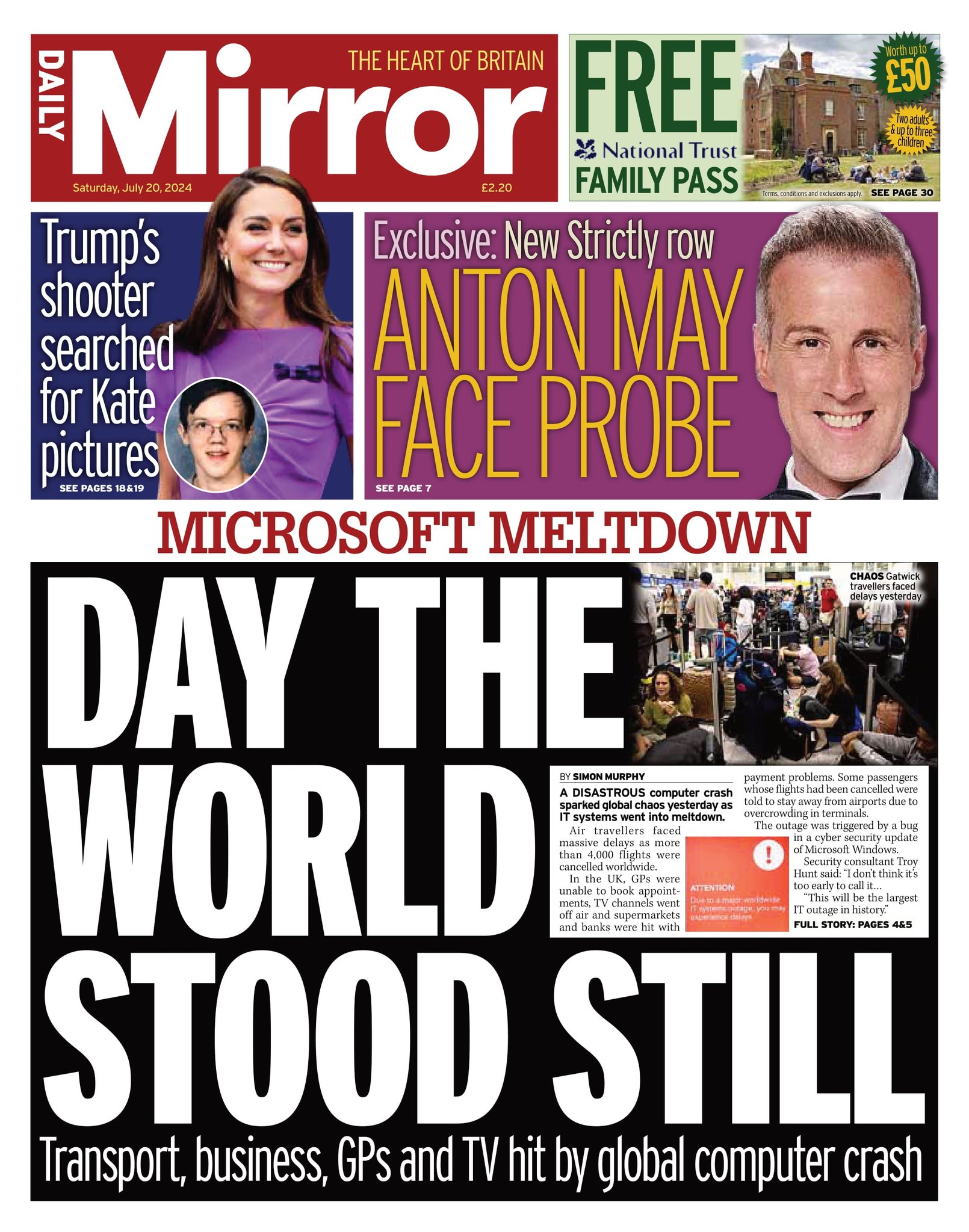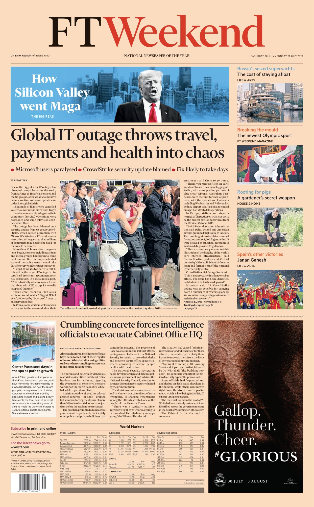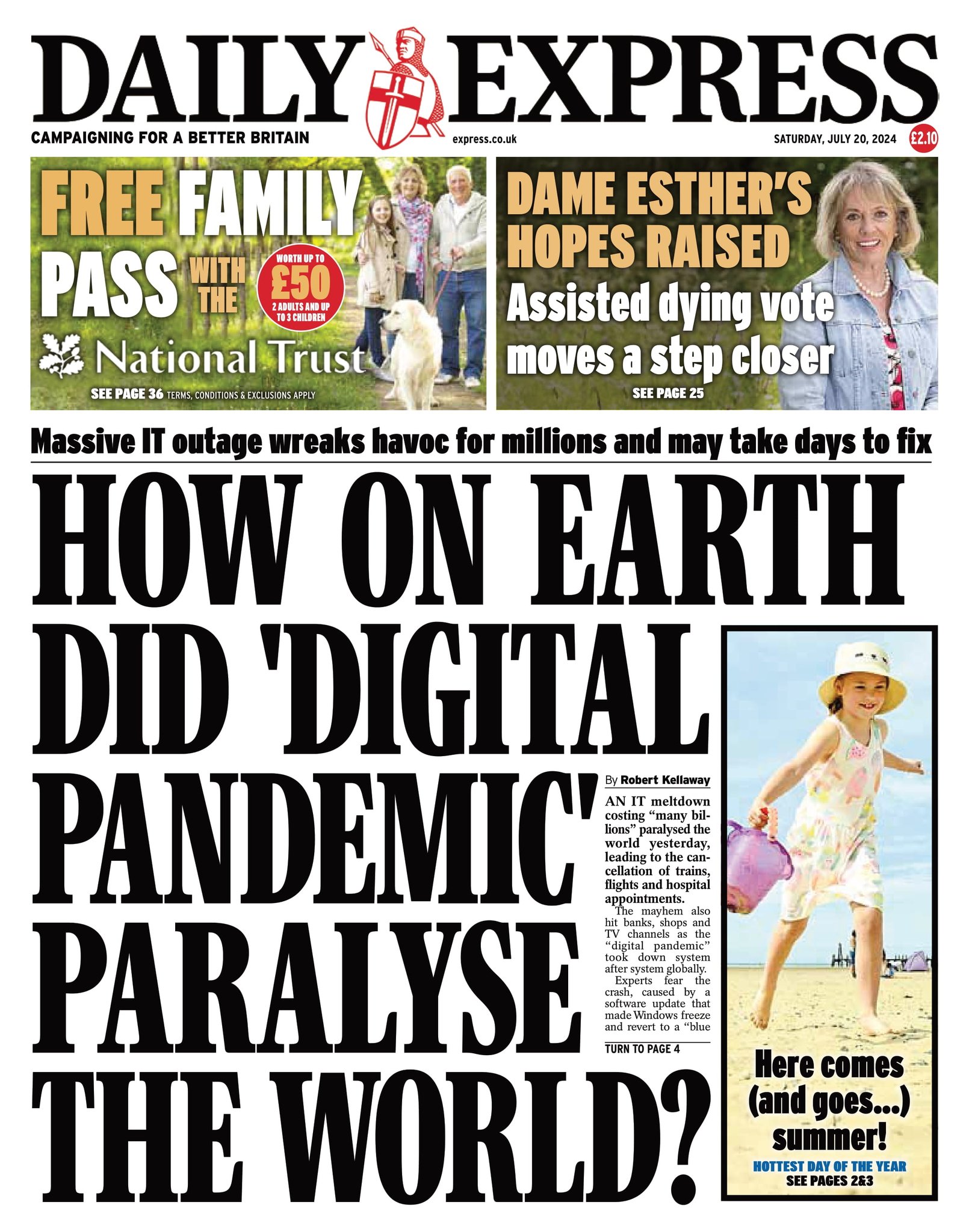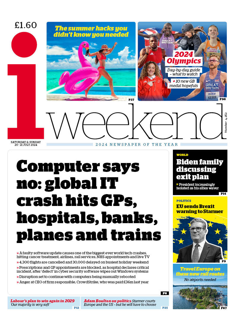The i weekend reports on a global IT crash affecting GPs, hospitals, airlines, railways, and banks.