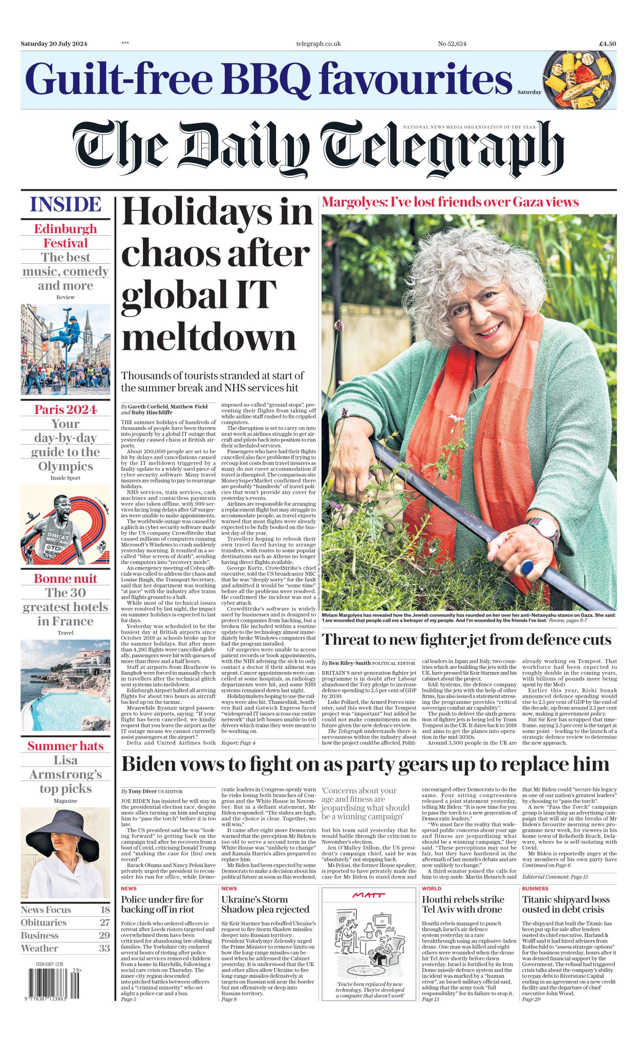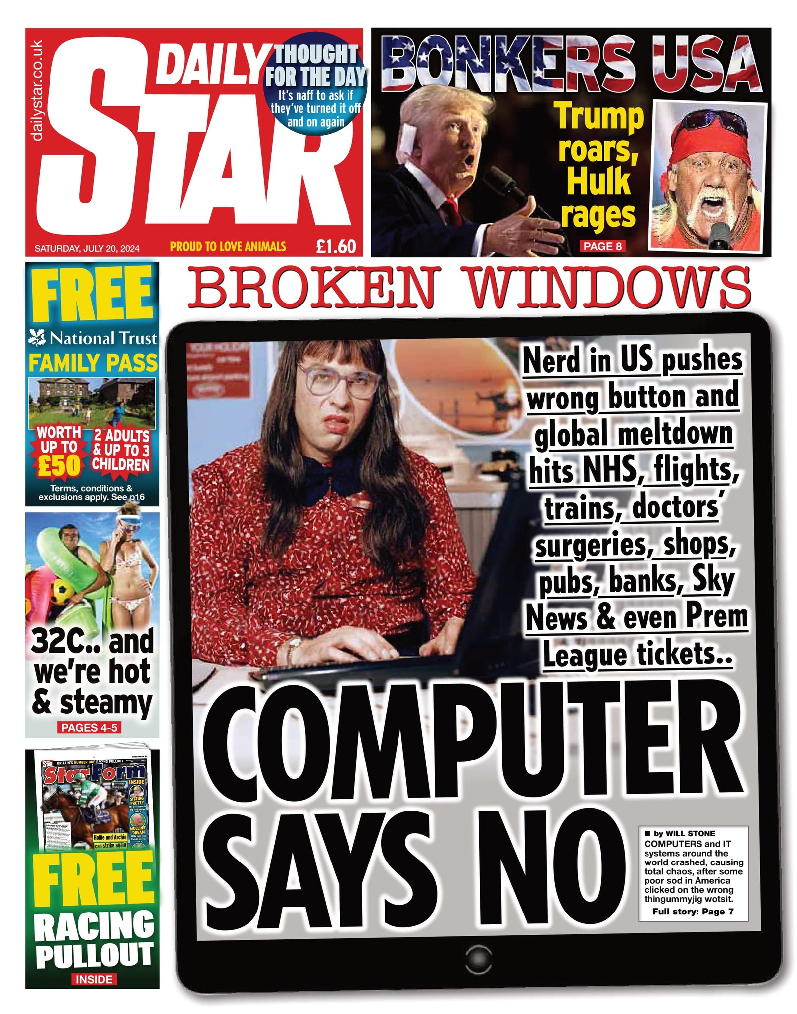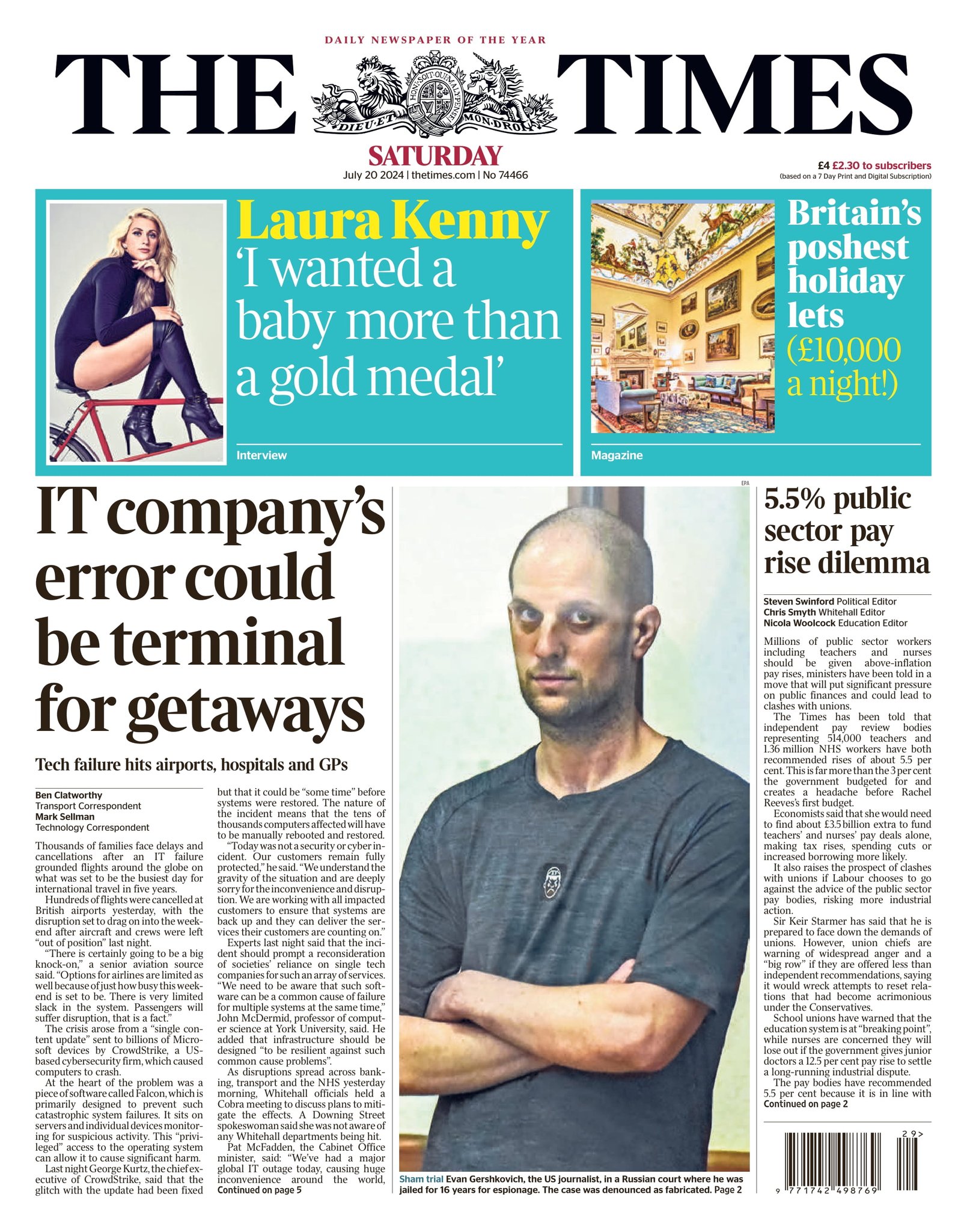 The i weekend reports on a global IT crash affecting GPs, hospitals, airlines, railways, and banks.