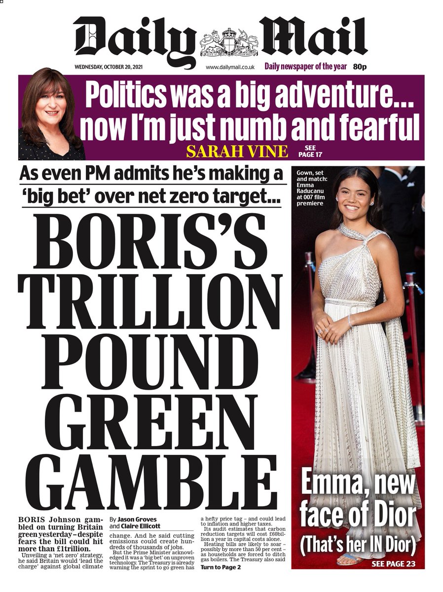 It could cost £1trn for Britain to reach net zero, according to the Daily Mail.