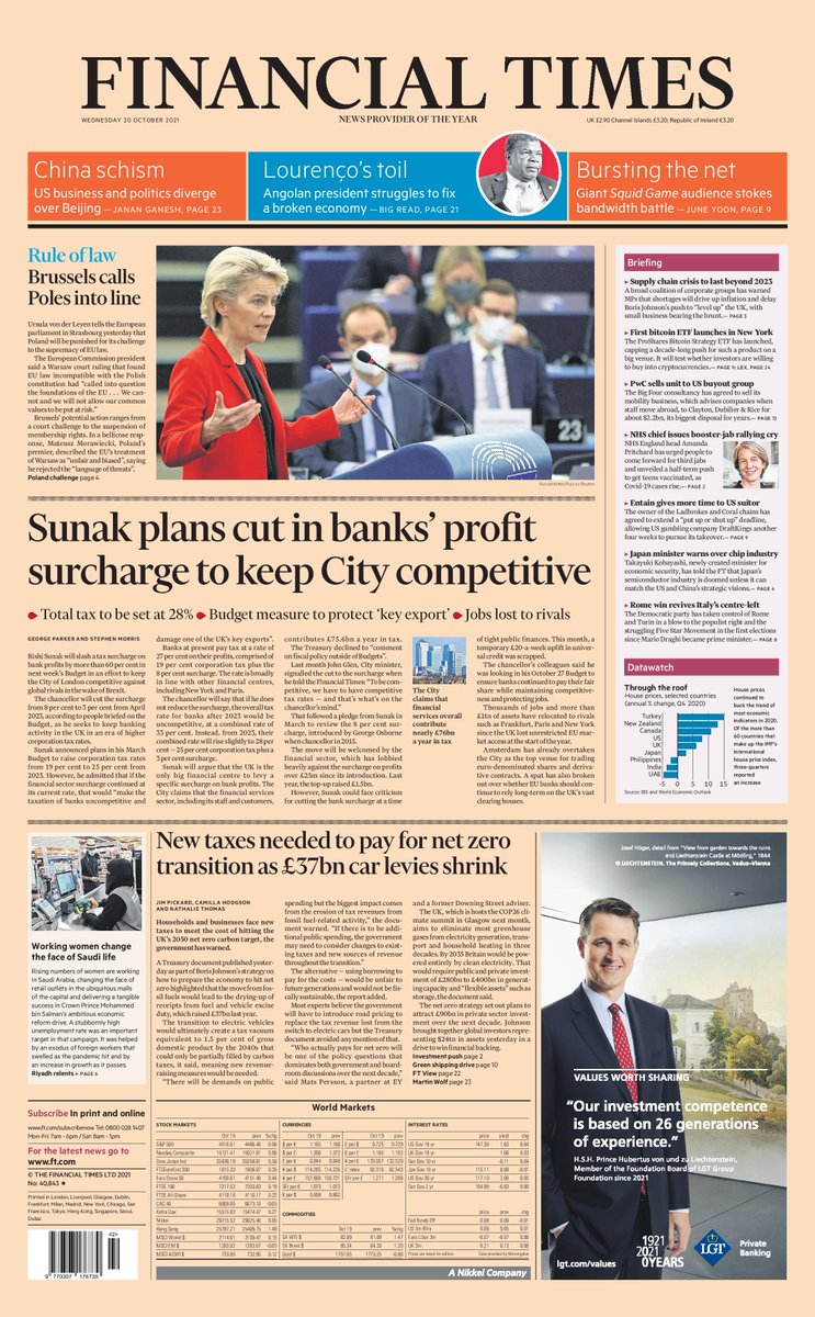 The Chancellor of the Exchequer Rishi Sunak is set to cut a tax surcharge on bank profits by over 60% in next week’s Budget, the Financial Times are reporting.