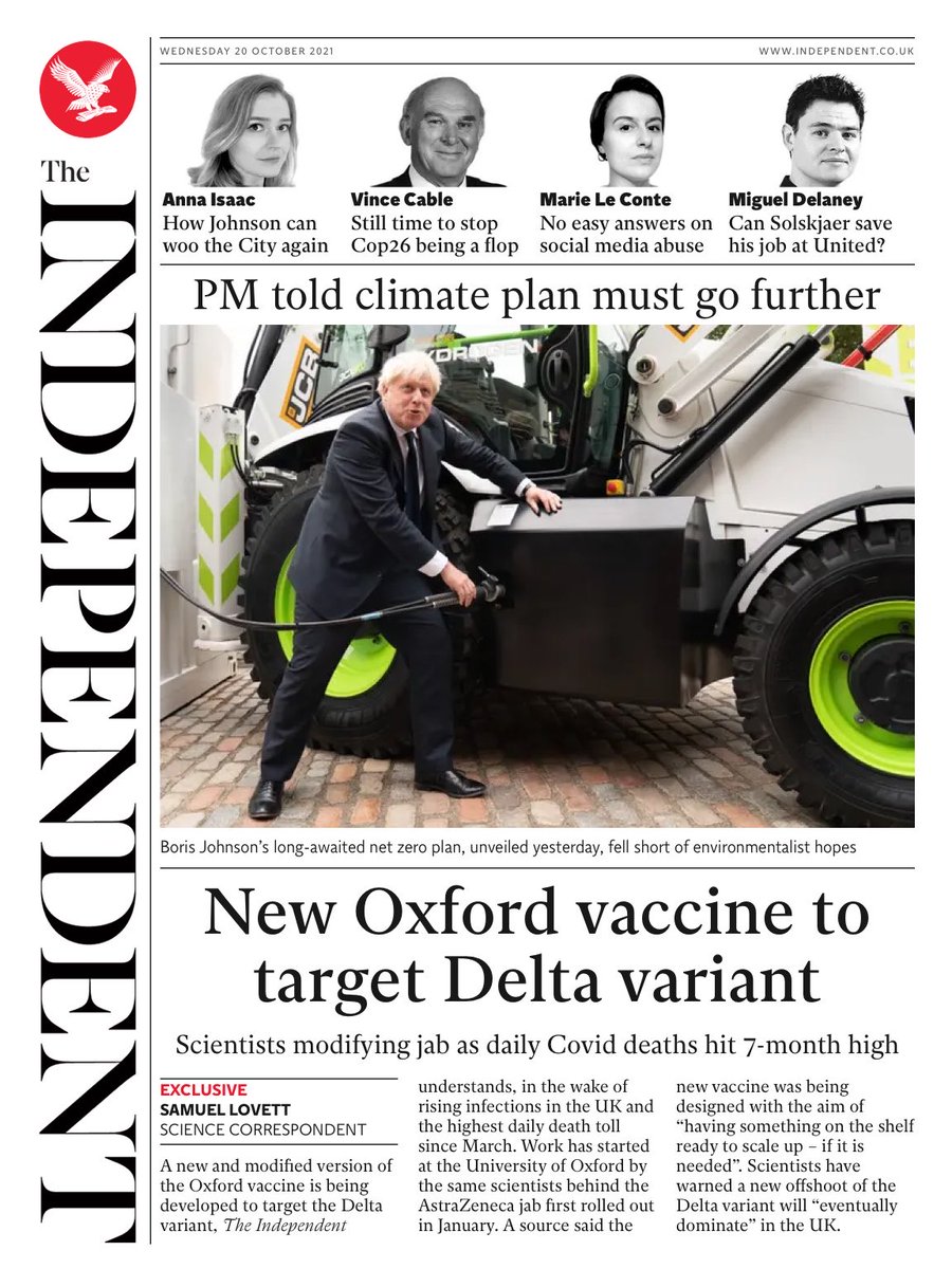 The Independent is leading on reports that a modified version of the Oxford vaccine is being developed to target the Delta variant, in the wake of rising infections in the UK.