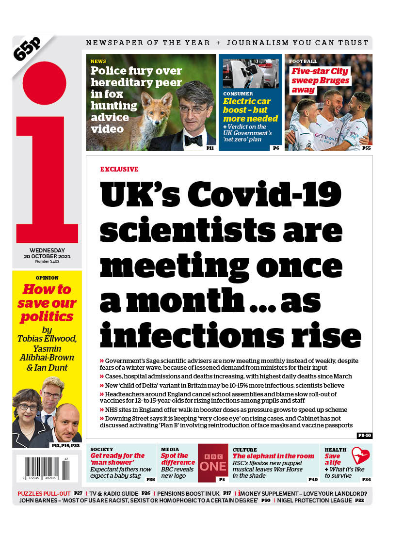 The Daily Mirror also leads on a story about the slow booster jab uptake, amid fears from experts about rising cases and a winter COVID-19 surge.
