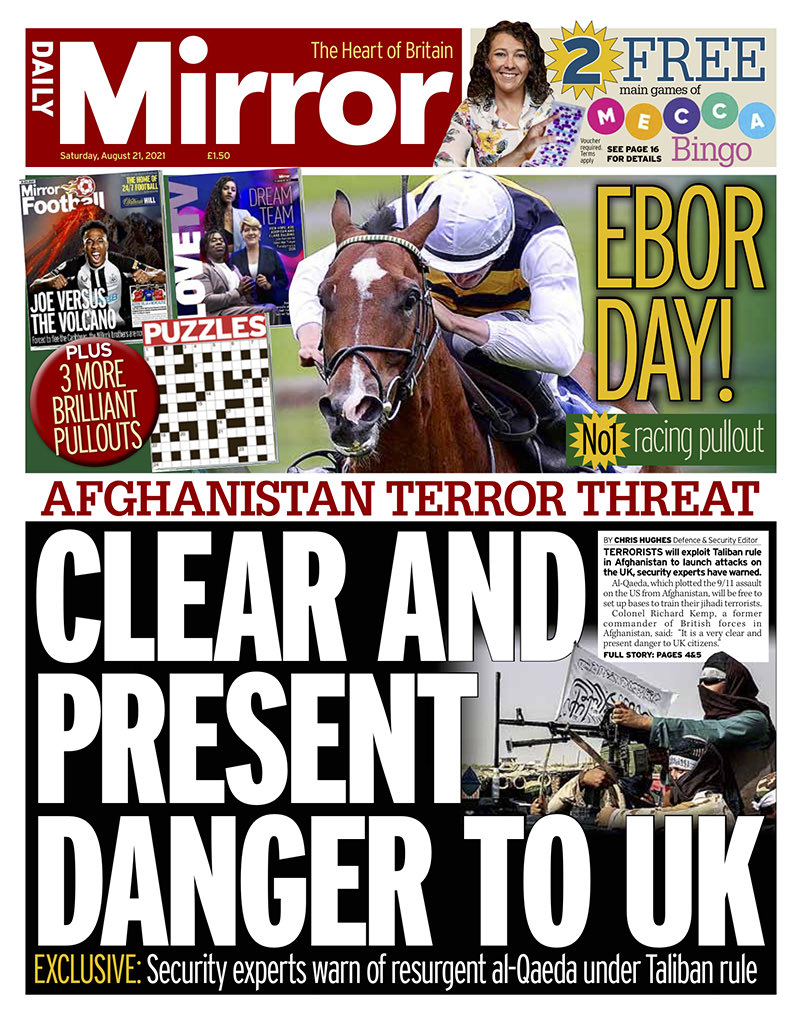 The Daily Mirror warns that terrorists will exploit Taliban rule in Afghanistan to launch attacks on the UK.