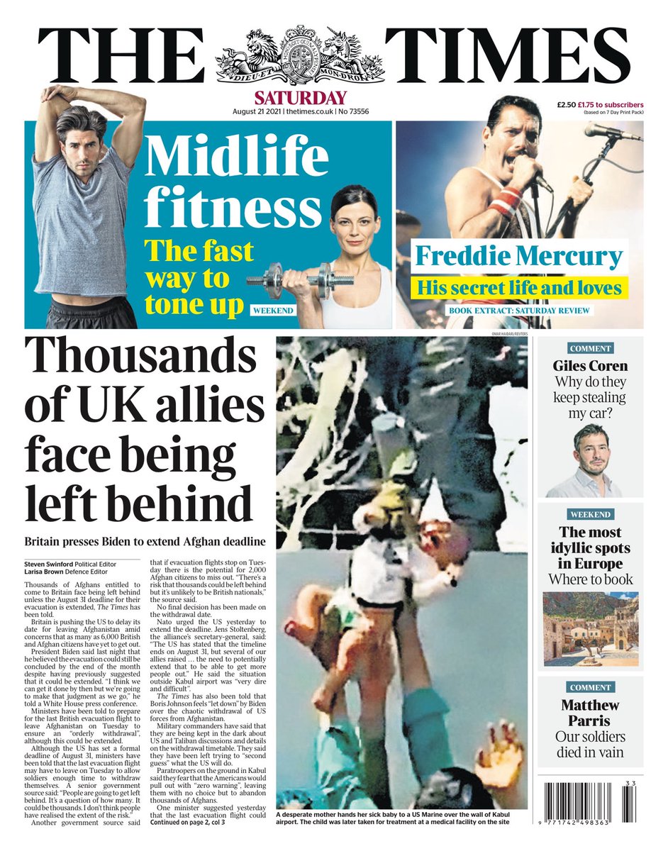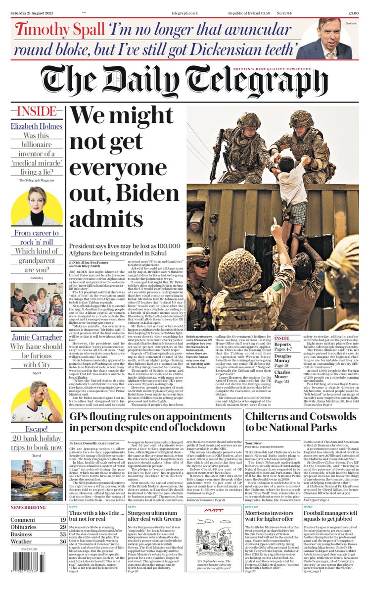 The Daily Telegraph highlights President Joe Biden’s admission that the US might not be able to rescue everyone it wants to from Afghanistan.