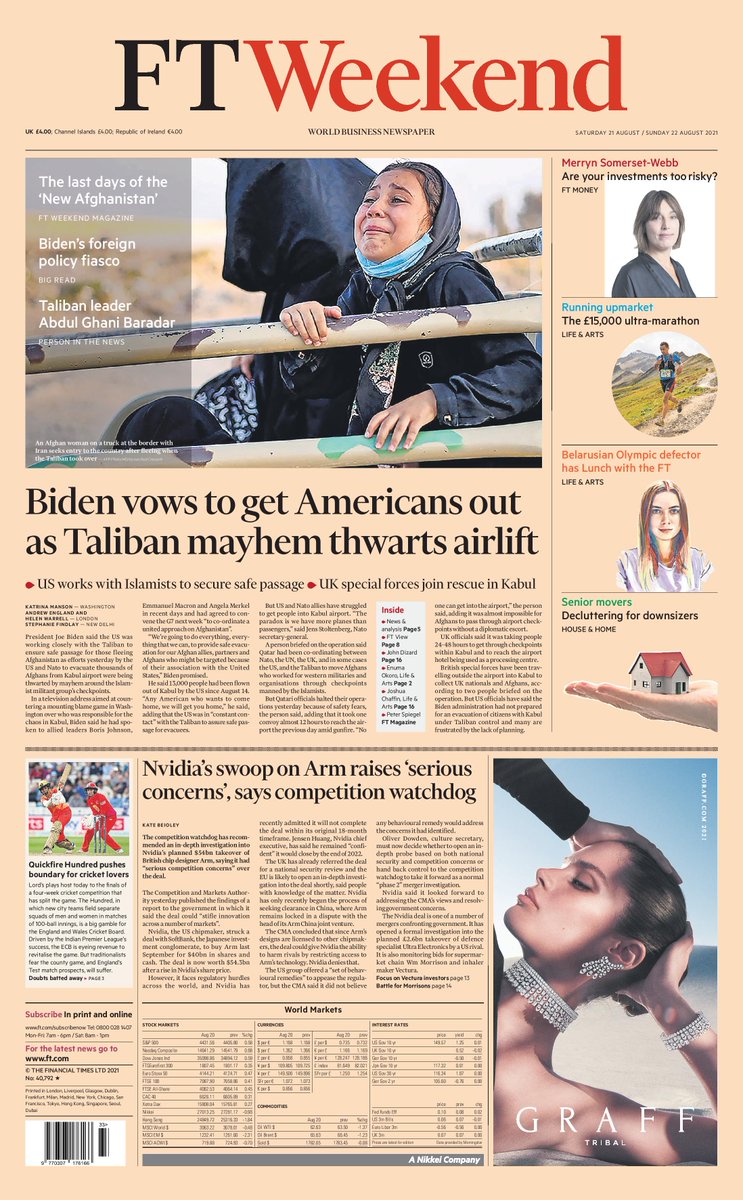 The Financial Times leads with US President Joe Biden’s pledge to work closely with the Taliban to ensure safe passage for those fleeing Afghanistan.