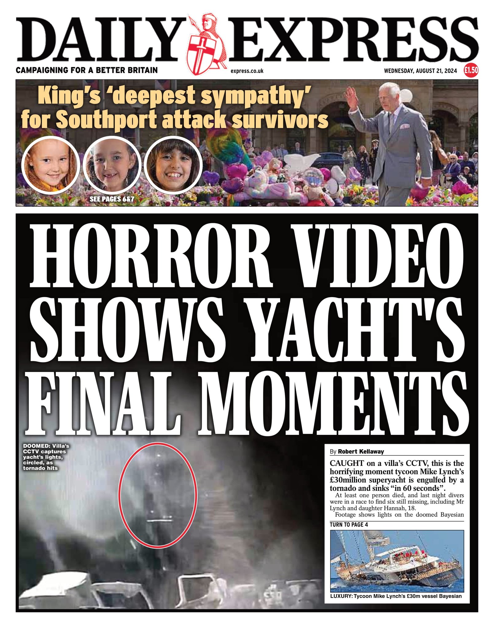 Caught on CCTV, footage shows the terrifying moment when tycoon Mike Lynch’s £30 million superyacht is engulfed by a tornado and sinks, resulting in at least one death and several others, including Mr Lynch and his daughter, still missing.