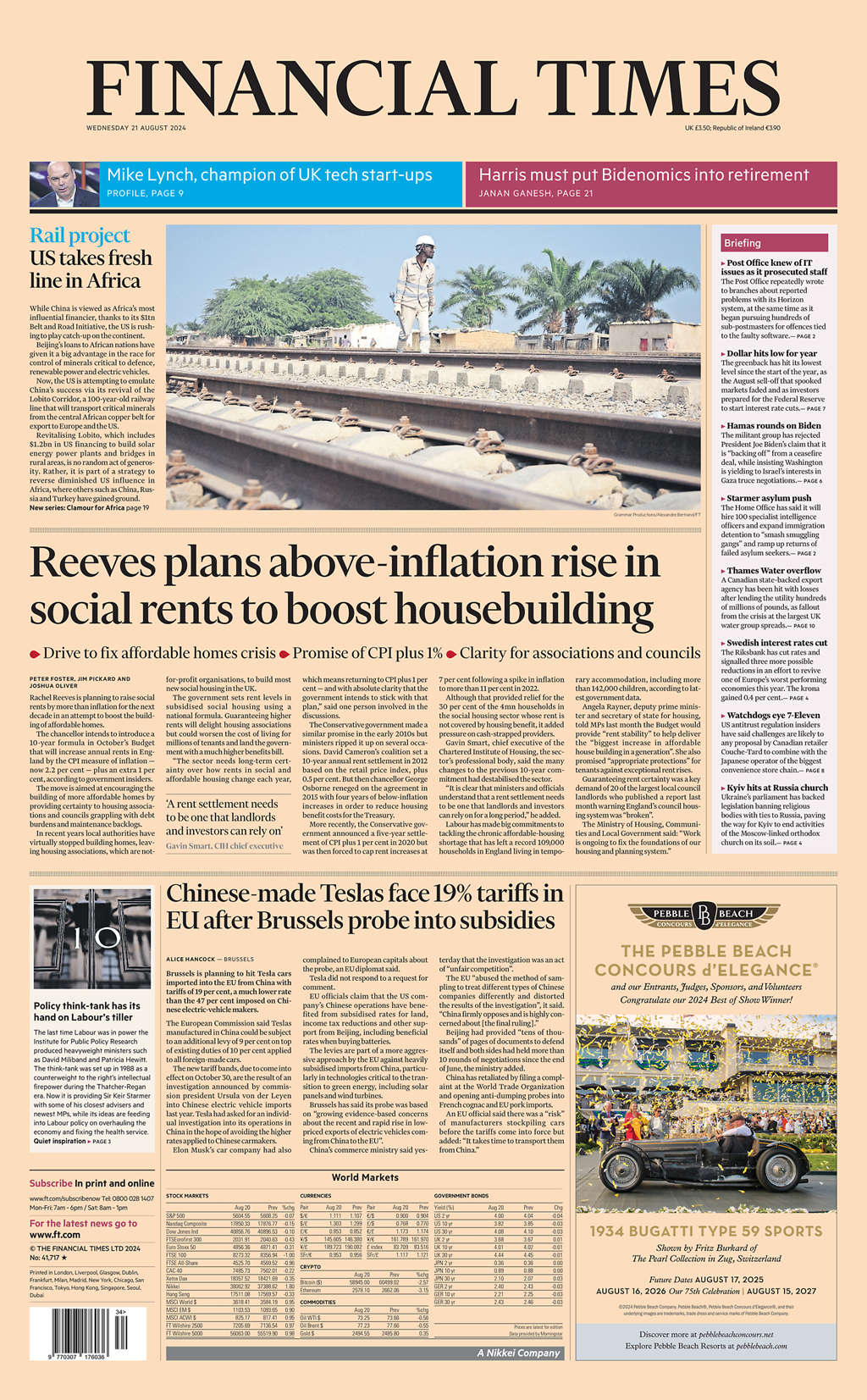 The Financial Times reports that Rachel Reeves intends to increase social rents above inflation to enhance affordable housing availability.