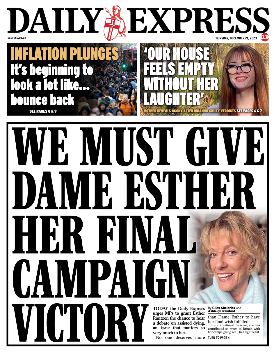 The Daily Express reveals MPs are being encouraged to give Esther Rantzen, a national treasure, an opportunity to attend a debate on assisted dying.