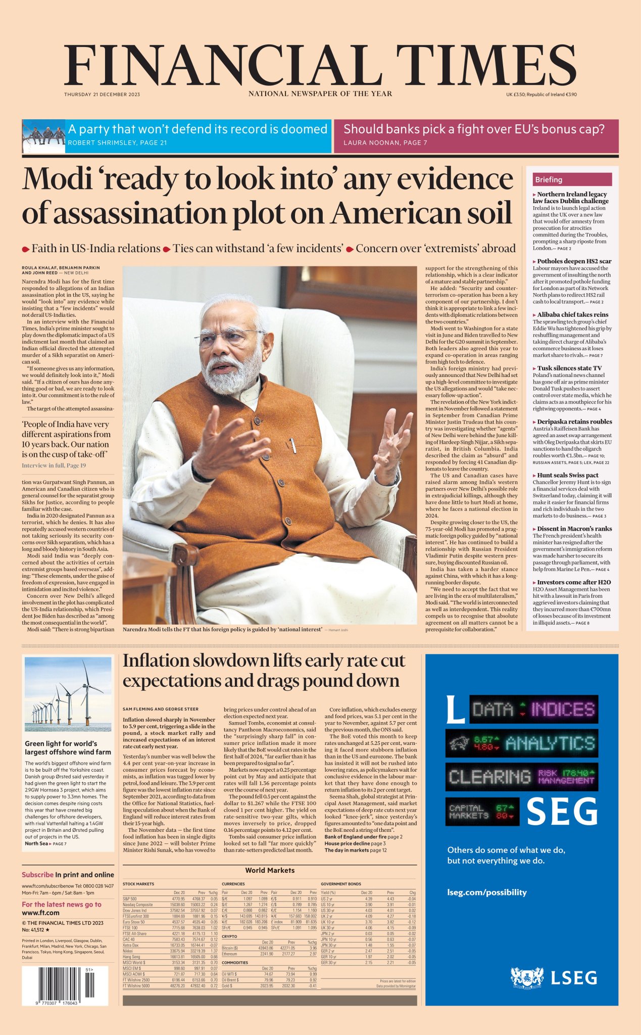 Modi addresses US assassination plot claims in a Financial Times interview.