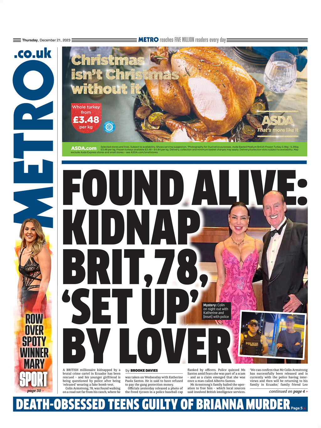 The Metro reports on the police questioning the young girlfriend of a kidnapped British millionaire over potential involvement in the Ecuador scam.