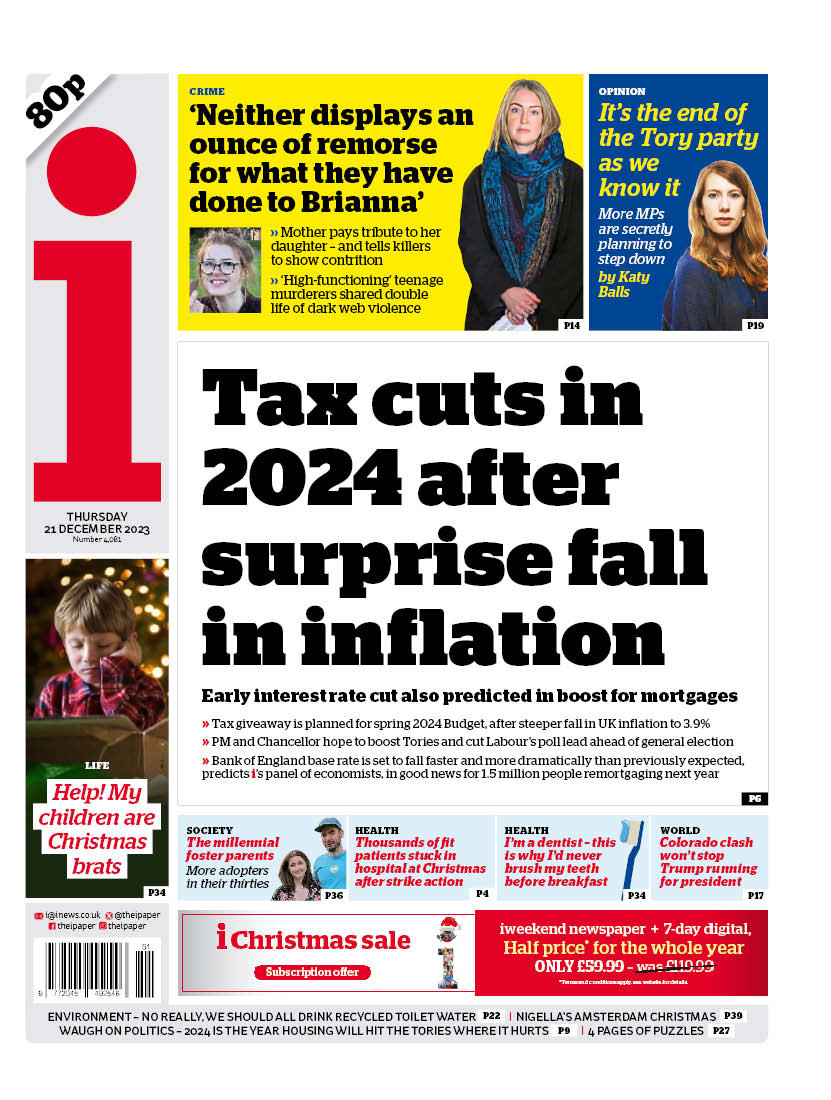 The i reveals a tax cut in the 2024 spring Budget due to a sharp fall in inflation to 3.
