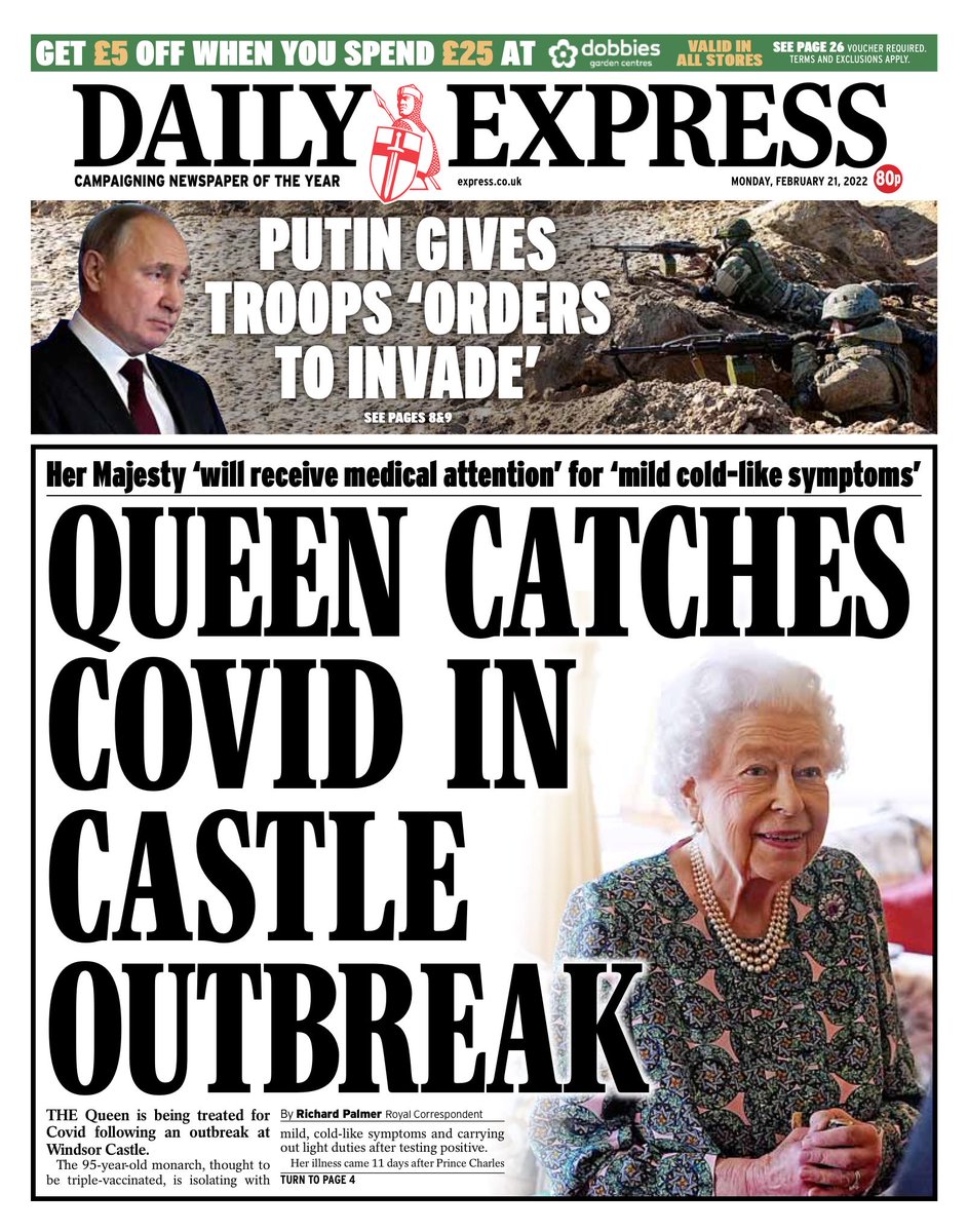 The Queen’s positive COVID-19 test is the lead for the Daily Express.