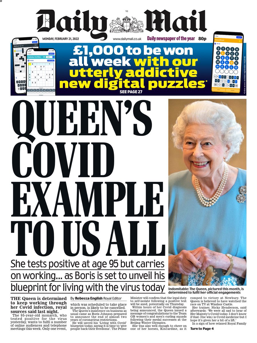 The Daily Mail praises the Queen’s determination to continue working, despite catching COVID-19.
