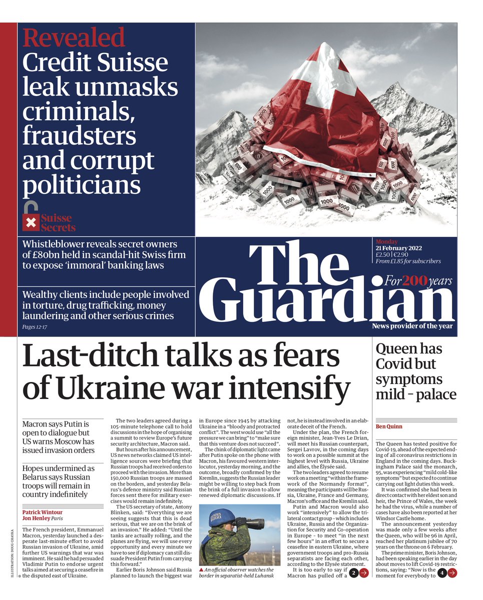 The Guardian leads with last-ditch talks to avoid a Russian invasion of Ukraine.