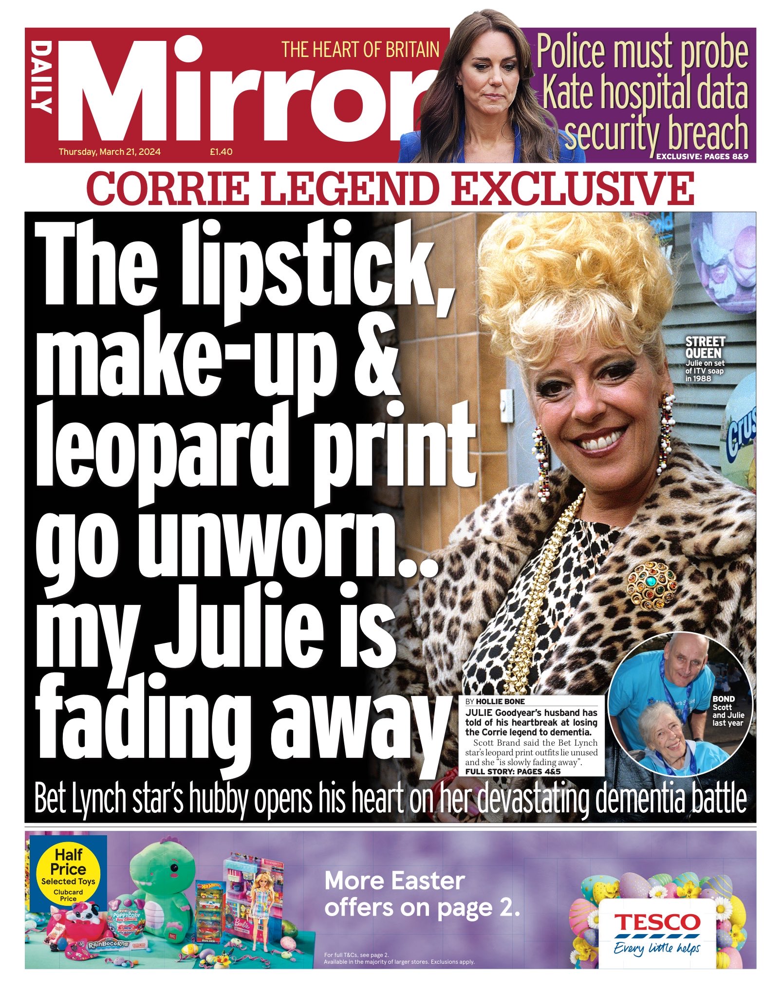 The Daily Mirror features an interview with Julie Goodyear’s husband discussing her dementia battle.