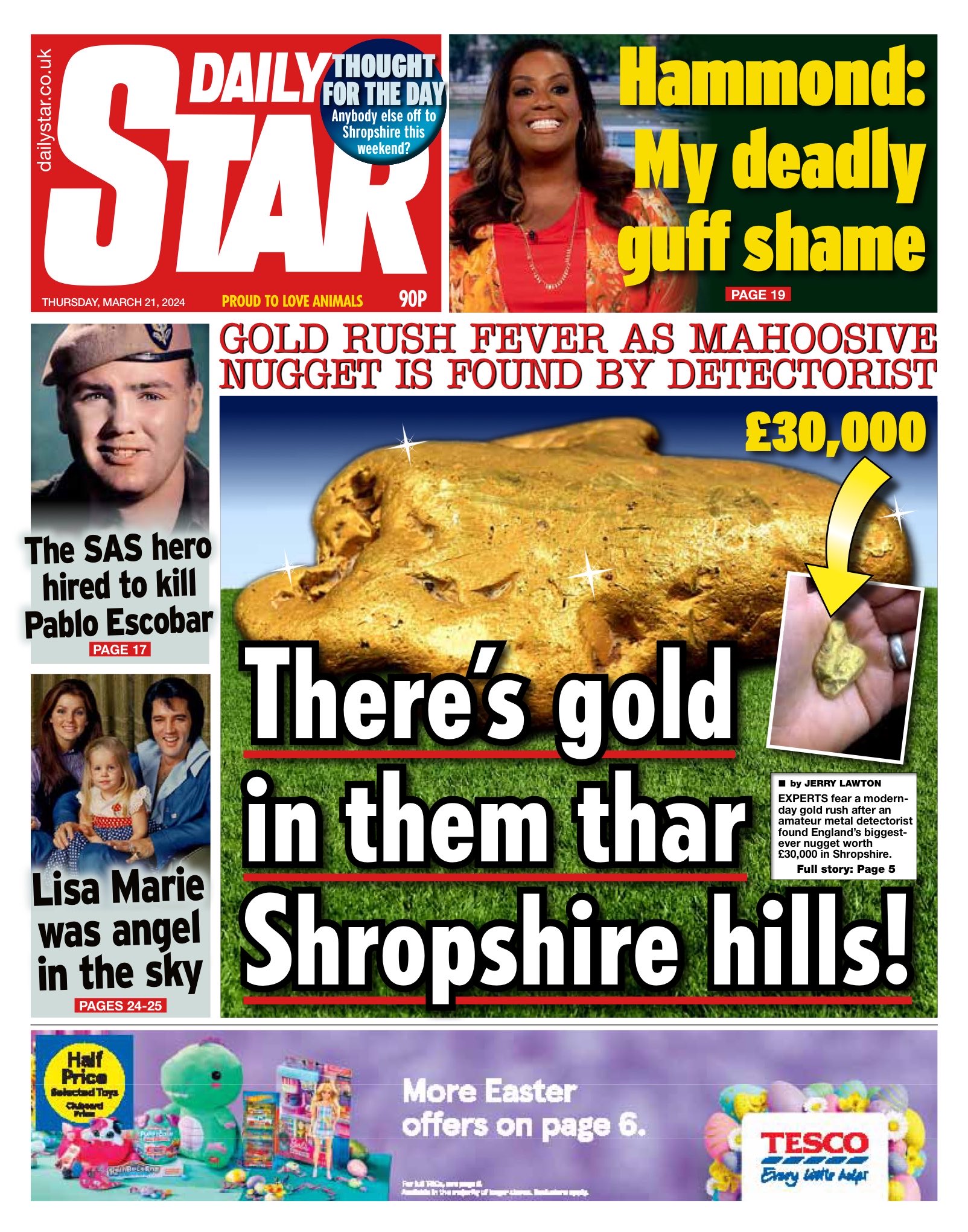 The Daily Star reports on the discovery of England’s largest gold nugget in Shropshire, valued at £30,000.